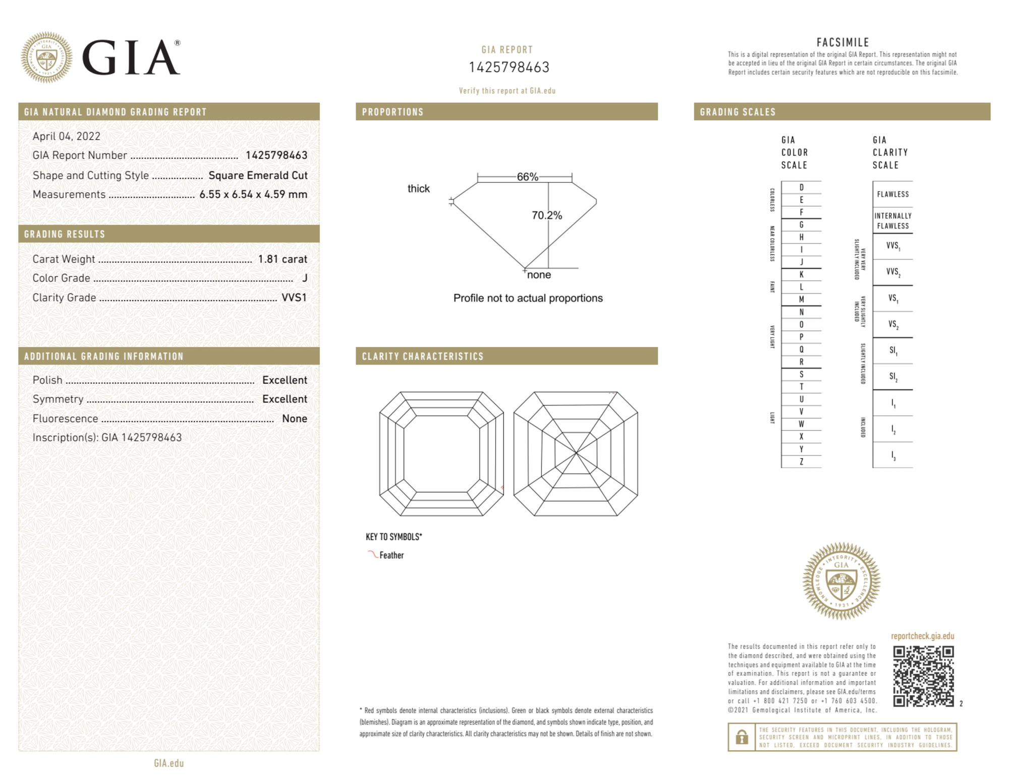 The GIA certificate (#1425798463) is an independent grading report that verifies this diamond's carat weight, color, clarity, cut, and other physical properties. It serves as a trusted third-party guarantee of the stone's quality. Always verify the certificate number on the issuing lab's website before purchasing.
