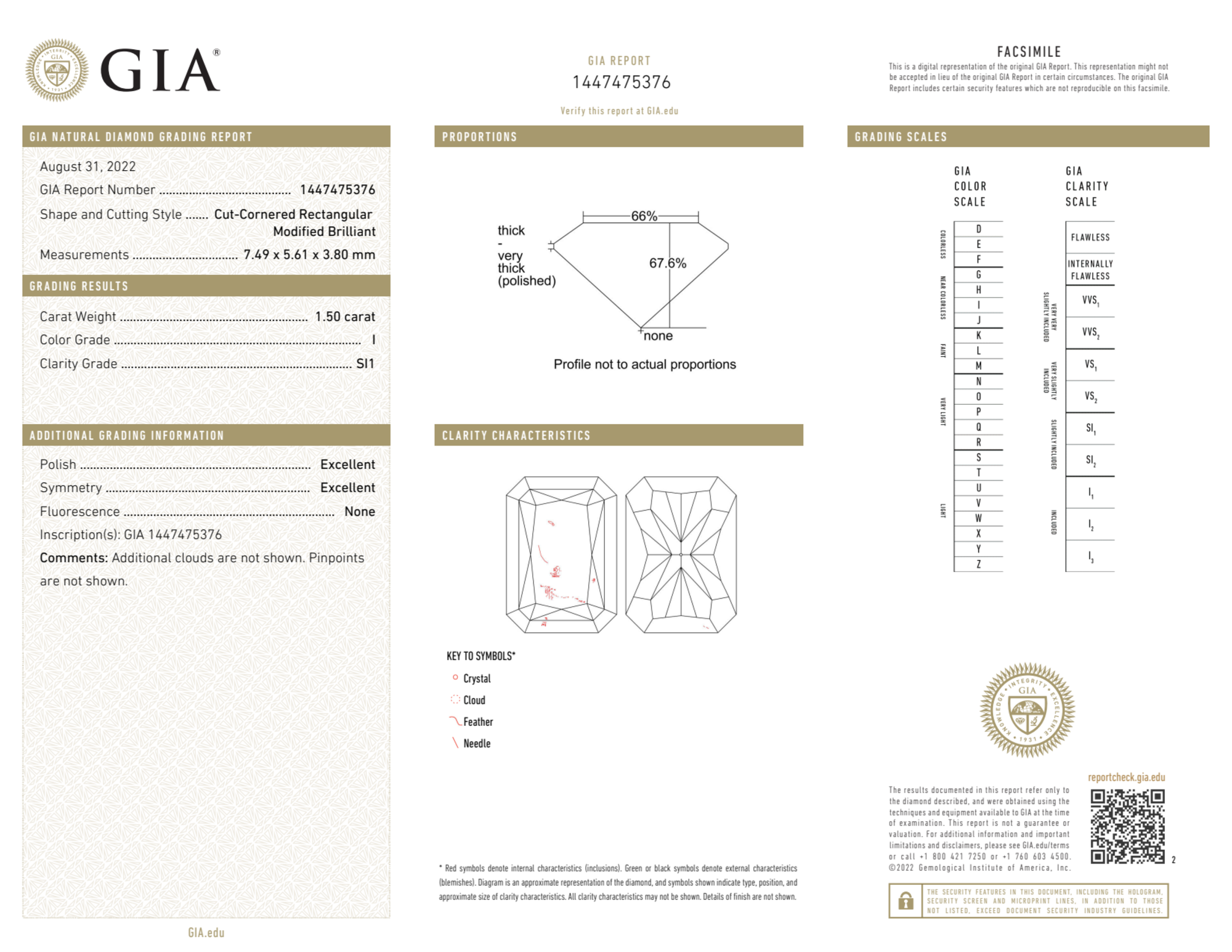 The GIA certificate (#1447475376) is an independent grading report that verifies this diamond's carat weight, color, clarity, cut, and other physical properties. It serves as a trusted third-party guarantee of the stone's quality. Always verify the certificate number on the issuing lab's website before purchasing.
