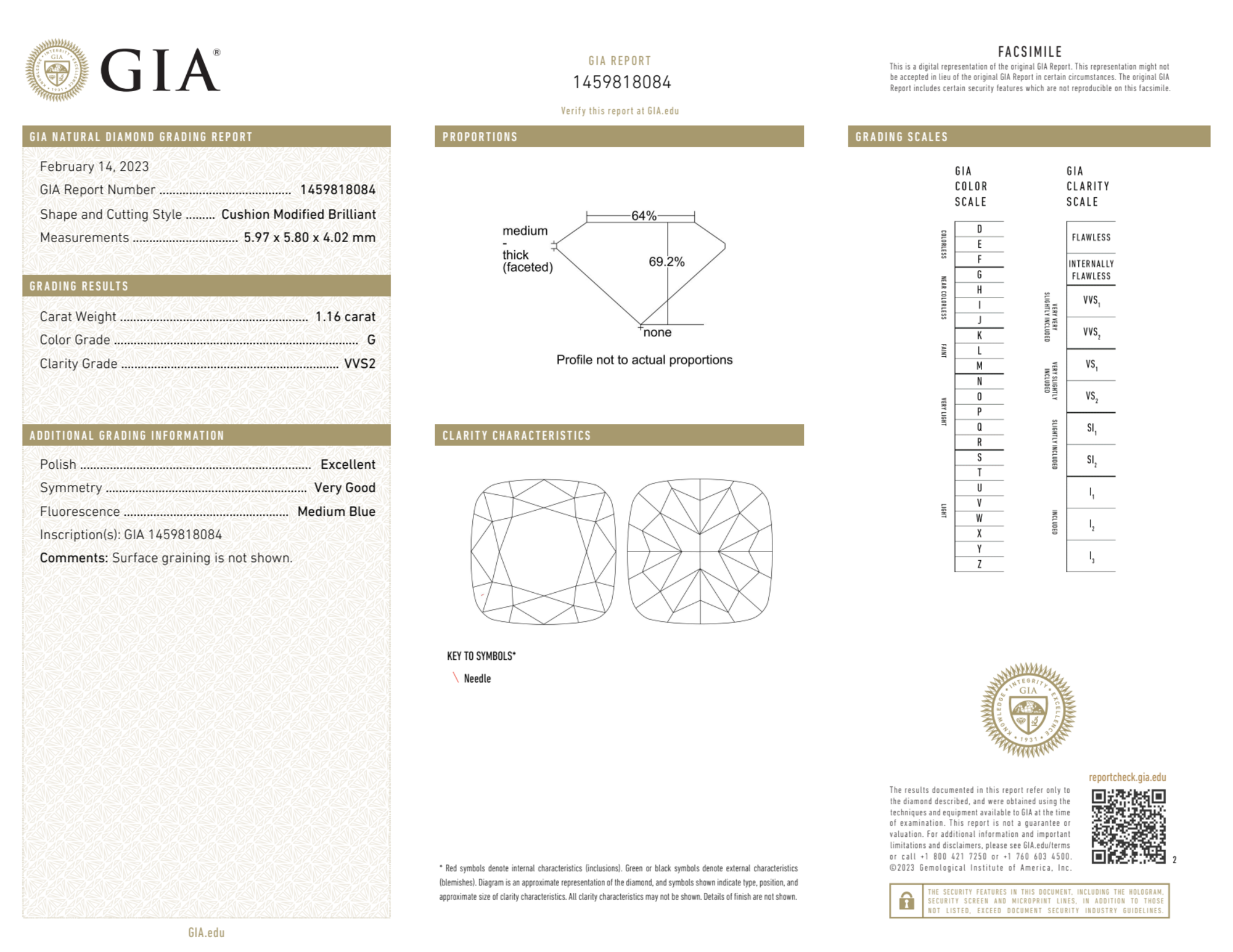 The GIA certificate (#1459818084) is an independent grading report that verifies this diamond's carat weight, color, clarity, cut, and other physical properties. It serves as a trusted third-party guarantee of the stone's quality. Always verify the certificate number on the issuing lab's website before purchasing.
