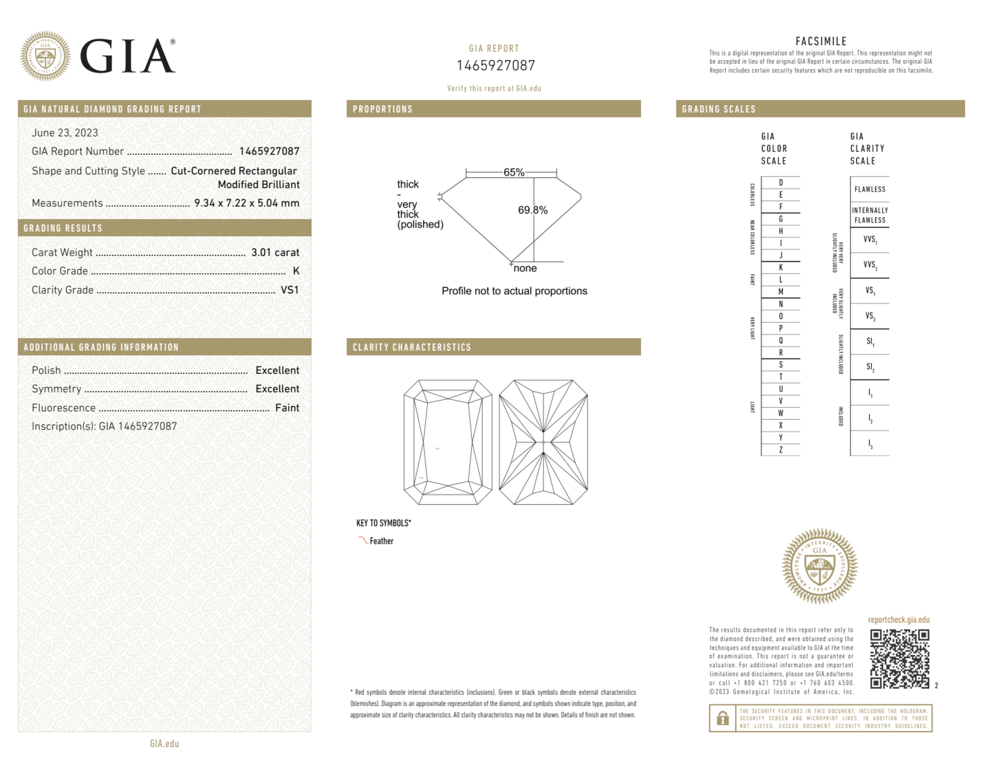 The GIA certificate (#1465927087) is an independent grading report that verifies this diamond's carat weight, color, clarity, cut, and other physical properties. It serves as a trusted third-party guarantee of the stone's quality. Always verify the certificate number on the issuing lab's website before purchasing.