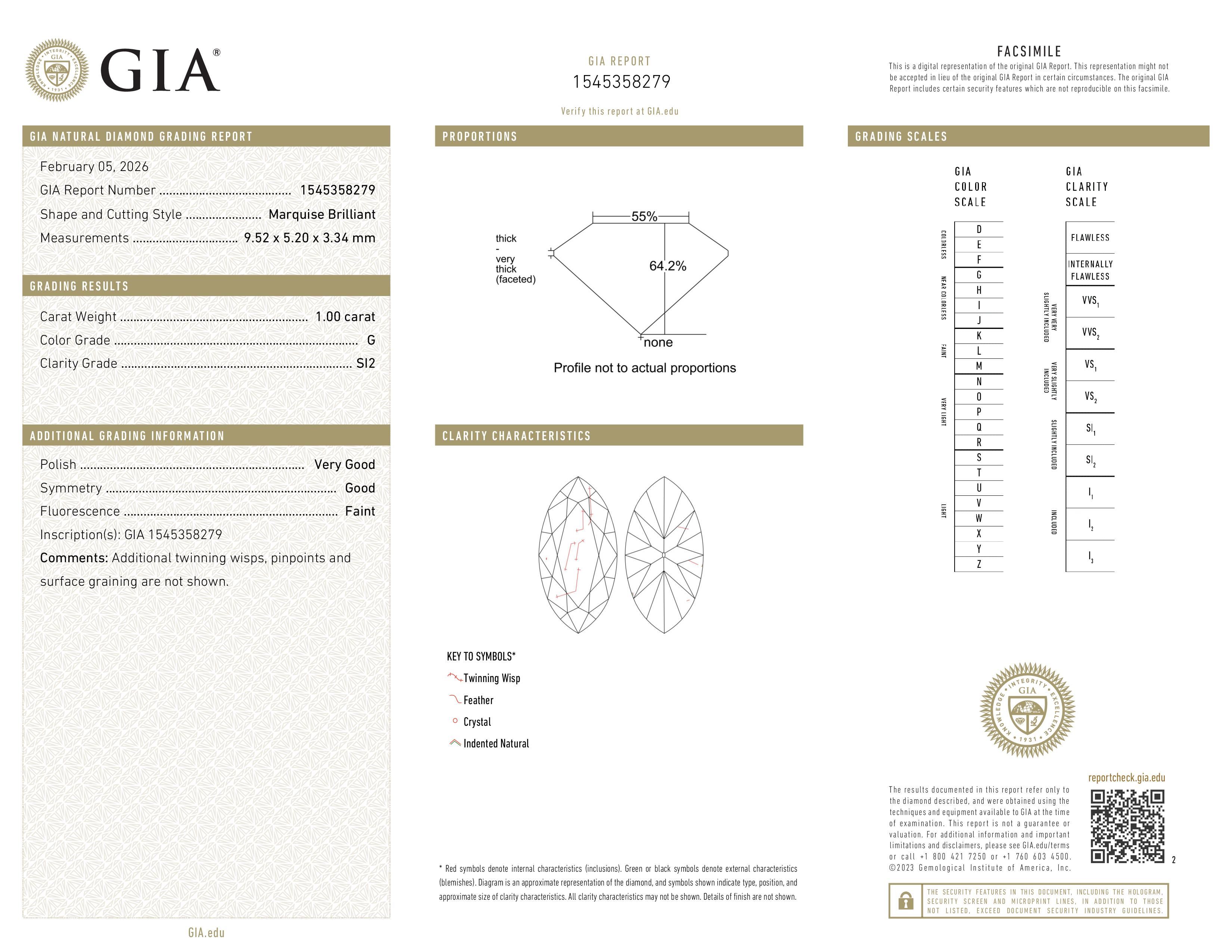 The GIA certificate (#1545358279) is an independent grading report that verifies this diamond's carat weight, color, clarity, cut, and other physical properties. It serves as a trusted third-party guarantee of the stone's quality. Always verify the certificate number on the issuing lab's website before purchasing.