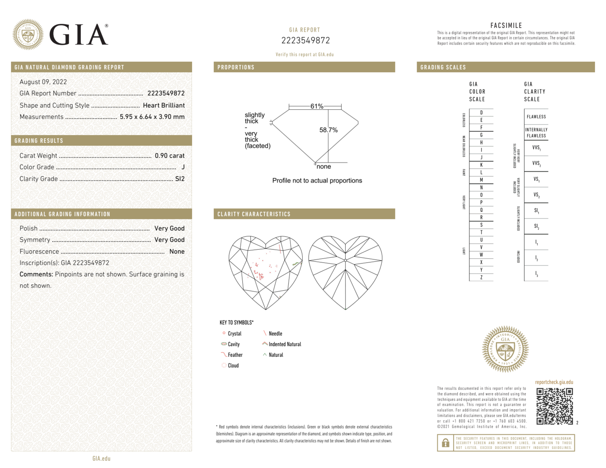 The GIA certificate (#2223549872) is an independent grading report that verifies this diamond's carat weight, color, clarity, cut, and other physical properties. It serves as a trusted third-party guarantee of the stone's quality. Always verify the certificate number on the issuing lab's website before purchasing.