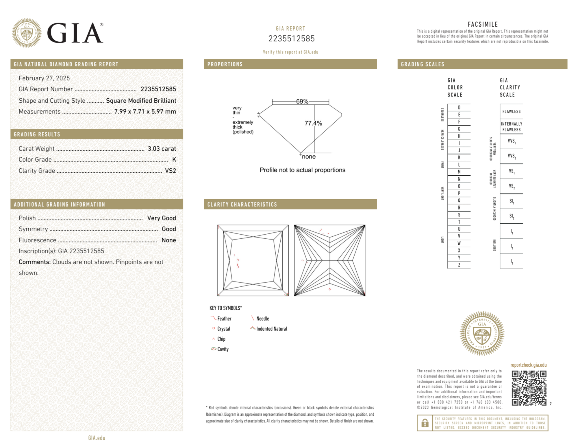The GIA certificate (#2235512585) is an independent grading report that verifies this diamond's carat weight, color, clarity, cut, and other physical properties. It serves as a trusted third-party guarantee of the stone's quality. Always verify the certificate number on the issuing lab's website before purchasing.