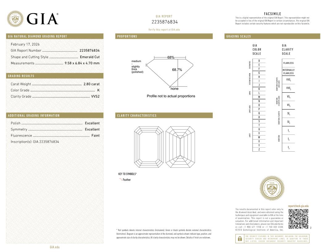 The GIA certificate (#2235876834) is an independent grading report that verifies this diamond's carat weight, color, clarity, cut, and other physical properties. It serves as a trusted third-party guarantee of the stone's quality. Always verify the certificate number on the issuing lab's website before purchasing.