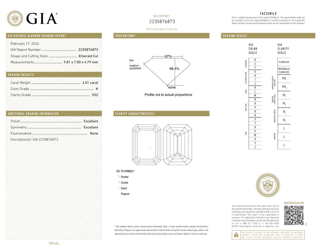 The GIA certificate (#2235876873) is an independent grading report that verifies this diamond's carat weight, color, clarity, cut, and other physical properties. It serves as a trusted third-party guarantee of the stone's quality. Always verify the certificate number on the issuing lab's website before purchasing.