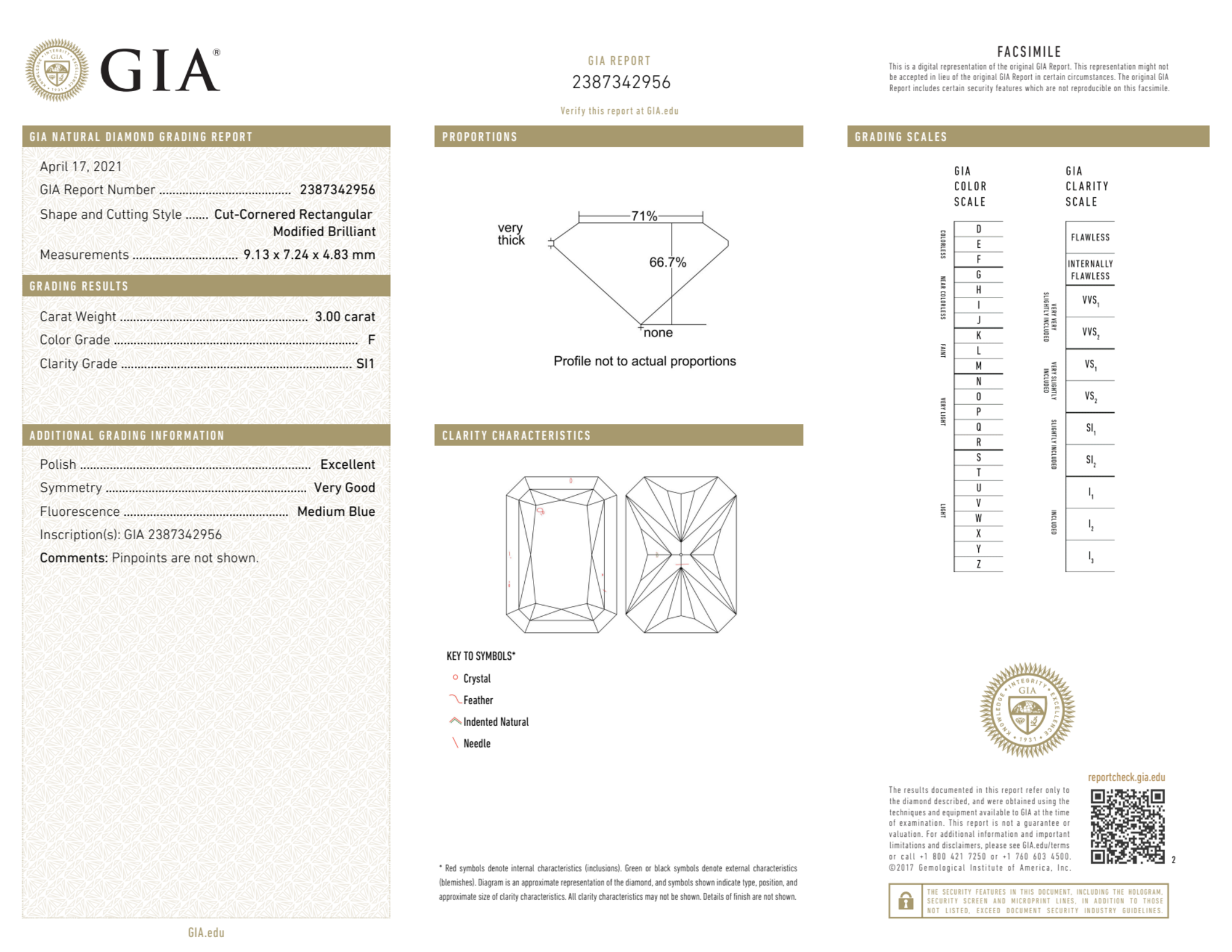 The GIA certificate (#2387342956) is an independent grading report that verifies this diamond's carat weight, color, clarity, cut, and other physical properties. It serves as a trusted third-party guarantee of the stone's quality. Always verify the certificate number on the issuing lab's website before purchasing.