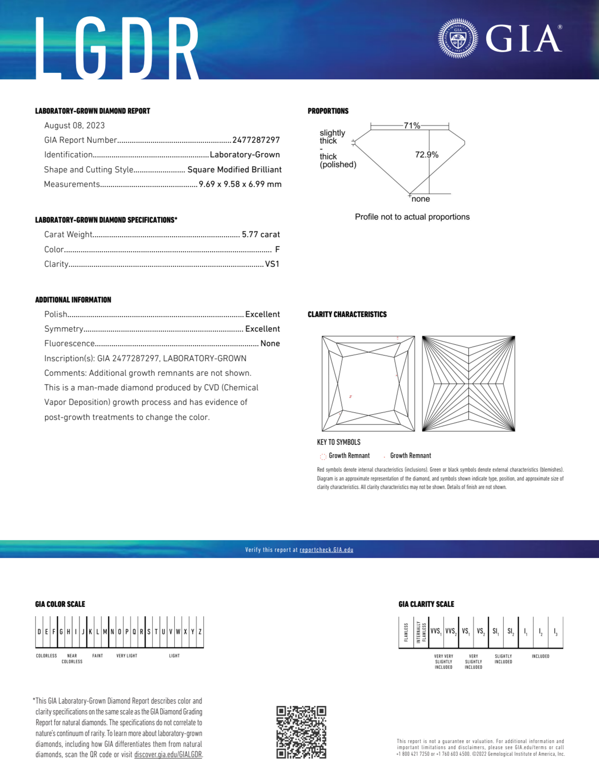 The GIA certificate (#2477287297) is an independent grading report that verifies this diamond's carat weight, color, clarity, cut, and other physical properties. It serves as a trusted third-party guarantee of the stone's quality. Always verify the certificate number on the issuing lab's website before purchasing.