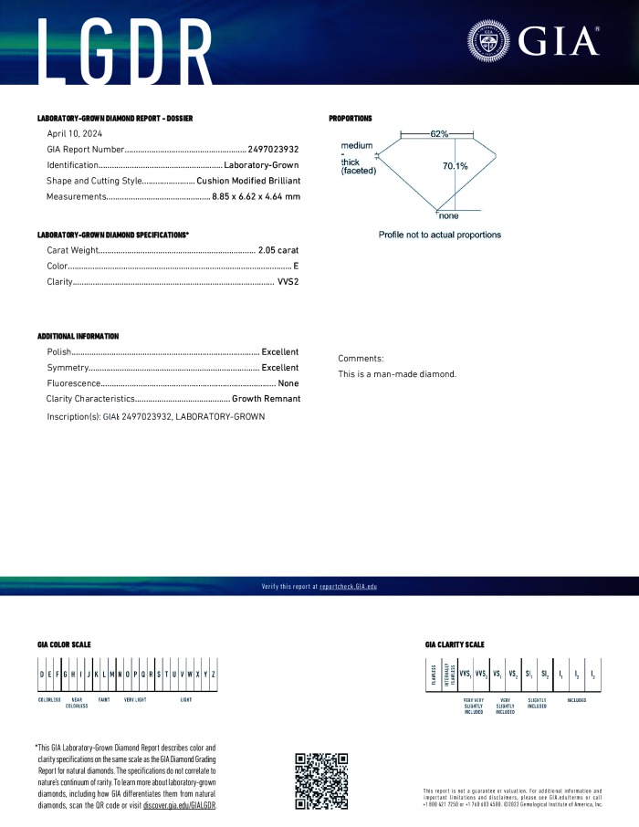 The GIA certificate (#2497023932) is an independent grading report that verifies this diamond's carat weight, color, clarity, cut, and other physical properties. It serves as a trusted third-party guarantee of the stone's quality. Always verify the certificate number on the issuing lab's website before purchasing.