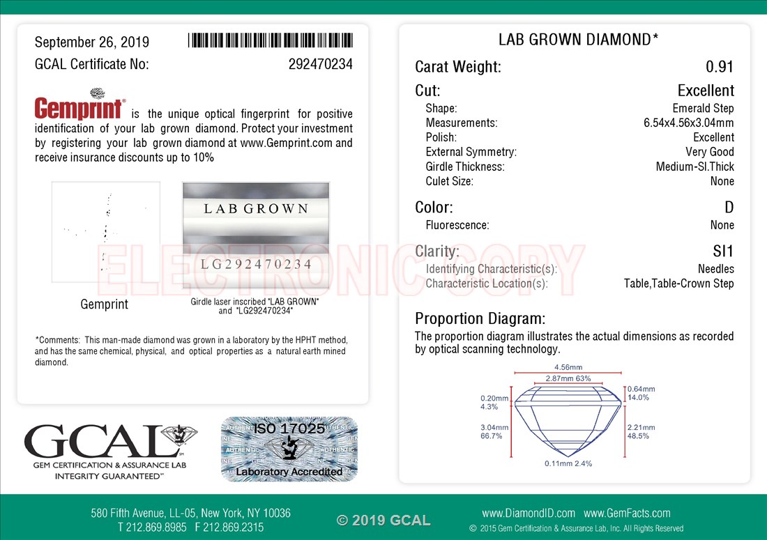 The GCAL certificate (#292470234) is an independent grading report that verifies this diamond's carat weight, color, clarity, cut, and other physical properties. It serves as a trusted third-party guarantee of the stone's quality. Always verify the certificate number on the issuing lab's website before purchasing.