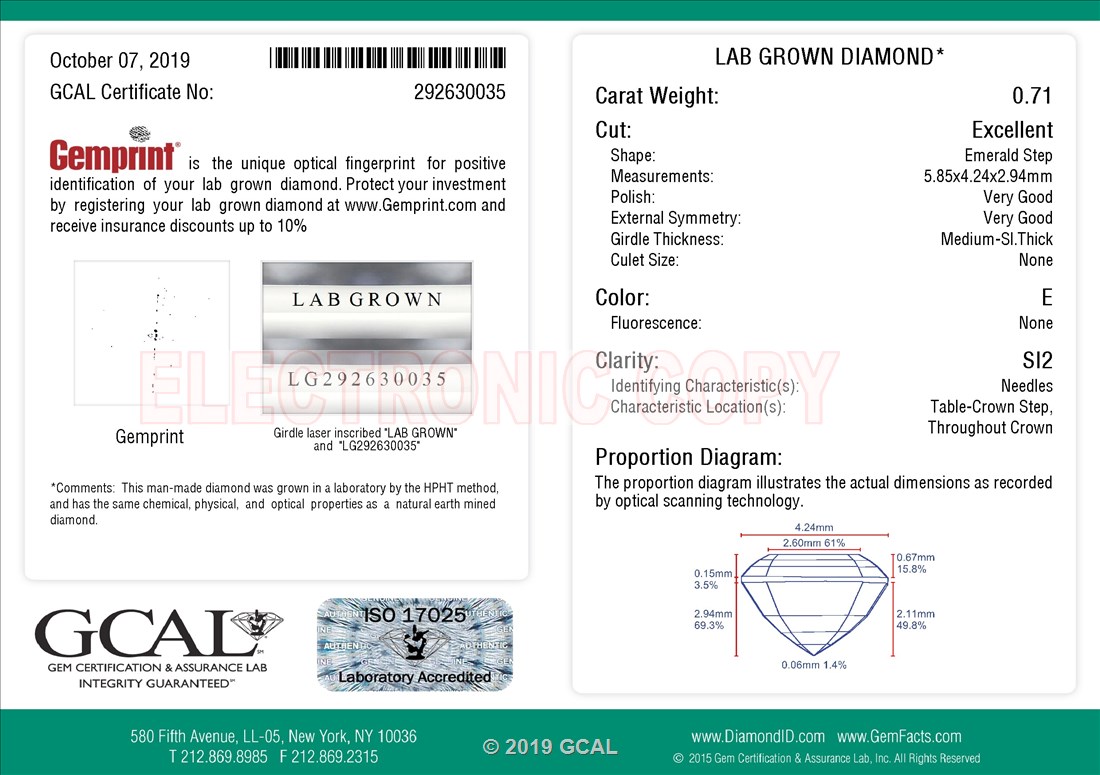 The GCAL certificate (#292630035) is an independent grading report that verifies this diamond's carat weight, color, clarity, cut, and other physical properties. It serves as a trusted third-party guarantee of the stone's quality. Always verify the certificate number on the issuing lab's website before purchasing.