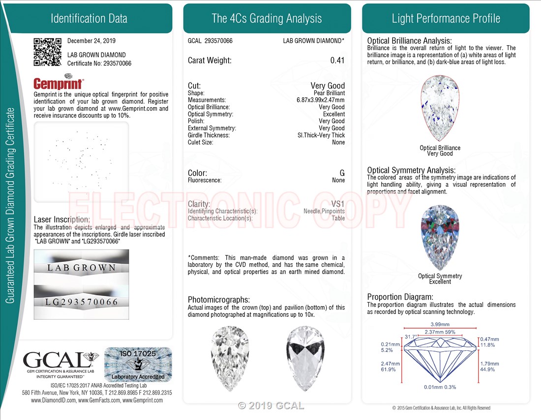 The GCAL certificate (#293570066) is an independent grading report that verifies this diamond's carat weight, color, clarity, cut, and other physical properties. It serves as a trusted third-party guarantee of the stone's quality. Always verify the certificate number on the issuing lab's website before purchasing.