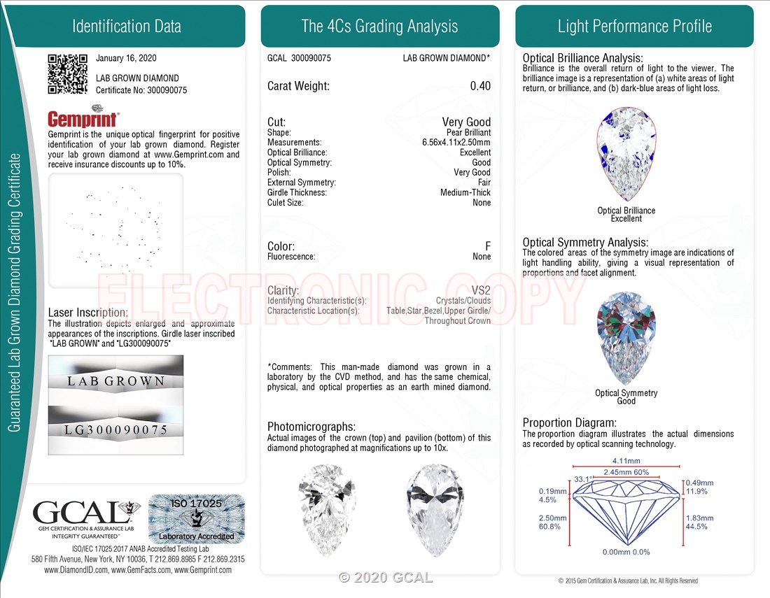 The GCAL certificate (#300090075) is an independent grading report that verifies this diamond's carat weight, color, clarity, cut, and other physical properties. It serves as a trusted third-party guarantee of the stone's quality. Always verify the certificate number on the issuing lab's website before purchasing.
