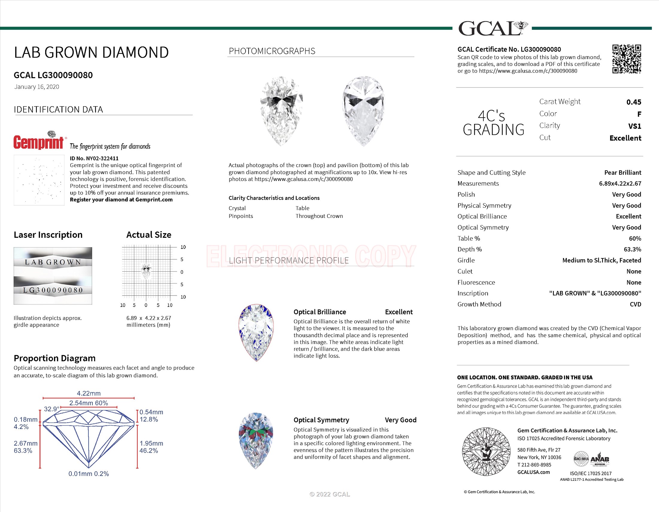 The GCAL certificate (#300090080) is an independent grading report that verifies this diamond's carat weight, color, clarity, cut, and other physical properties. It serves as a trusted third-party guarantee of the stone's quality. Always verify the certificate number on the issuing lab's website before purchasing.