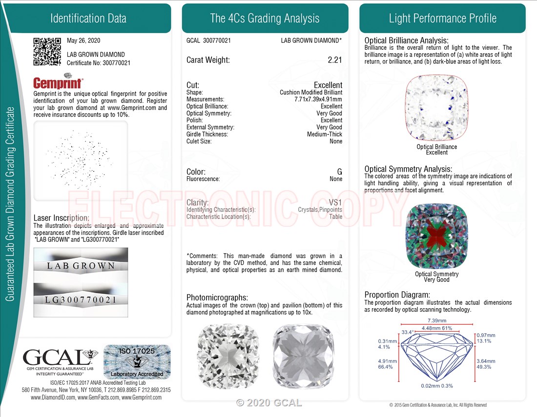 The GCAL certificate (#300770021) is an independent grading report that verifies this diamond's carat weight, color, clarity, cut, and other physical properties. It serves as a trusted third-party guarantee of the stone's quality. Always verify the certificate number on the issuing lab's website before purchasing.