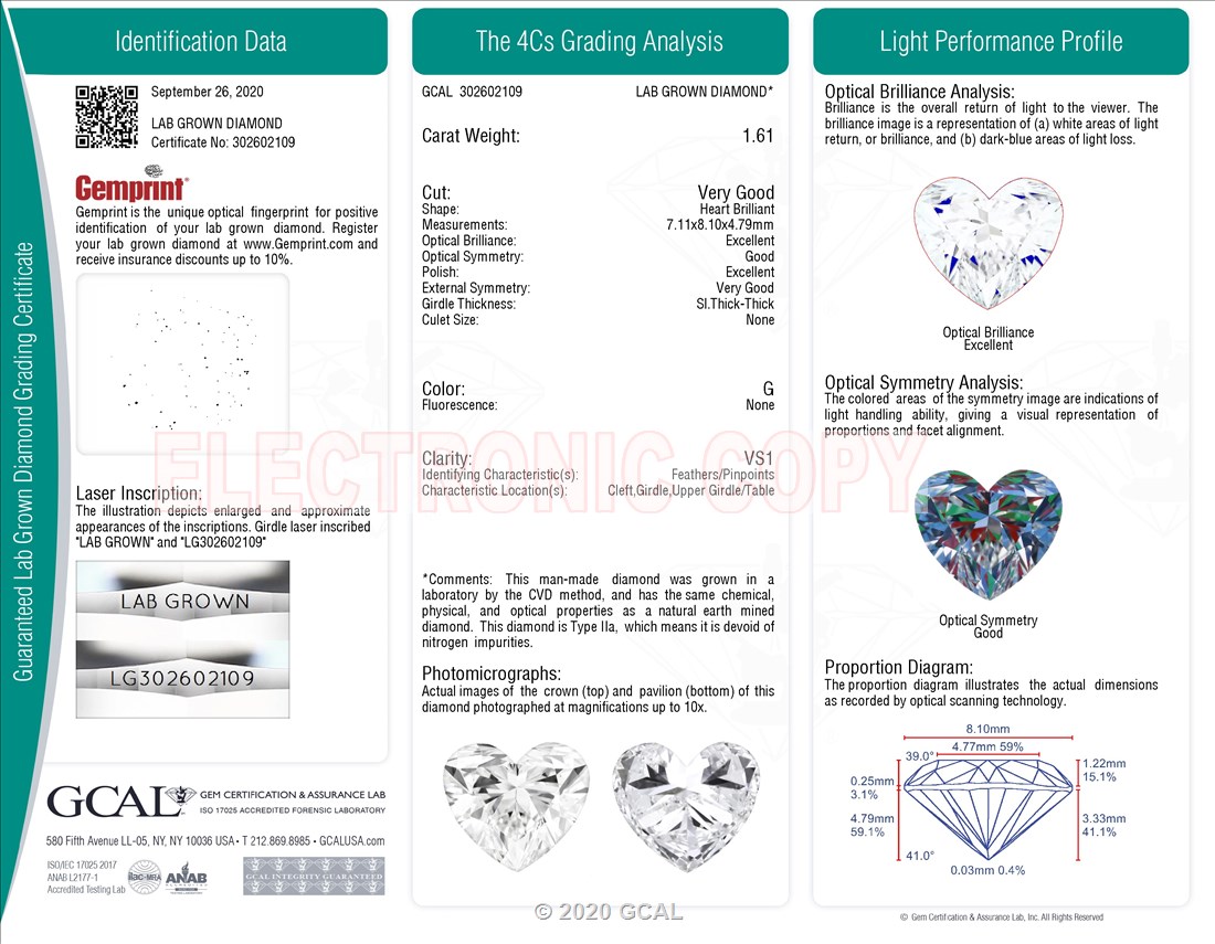 The GCAL certificate (#302602109) is an independent grading report that verifies this diamond's carat weight, color, clarity, cut, and other physical properties. It serves as a trusted third-party guarantee of the stone's quality. Always verify the certificate number on the issuing lab's website before purchasing.