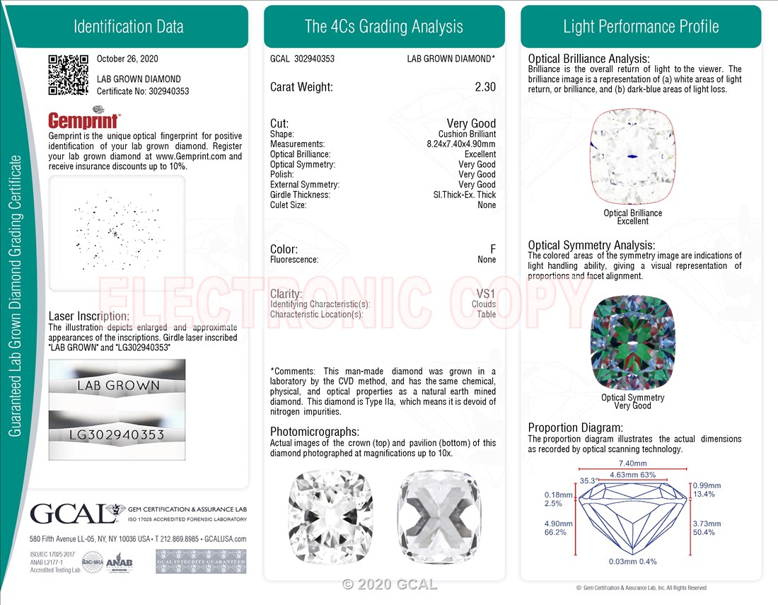 The GCAL certificate (#302940353) is an independent grading report that verifies this diamond's carat weight, color, clarity, cut, and other physical properties. It serves as a trusted third-party guarantee of the stone's quality. Always verify the certificate number on the issuing lab's website before purchasing.