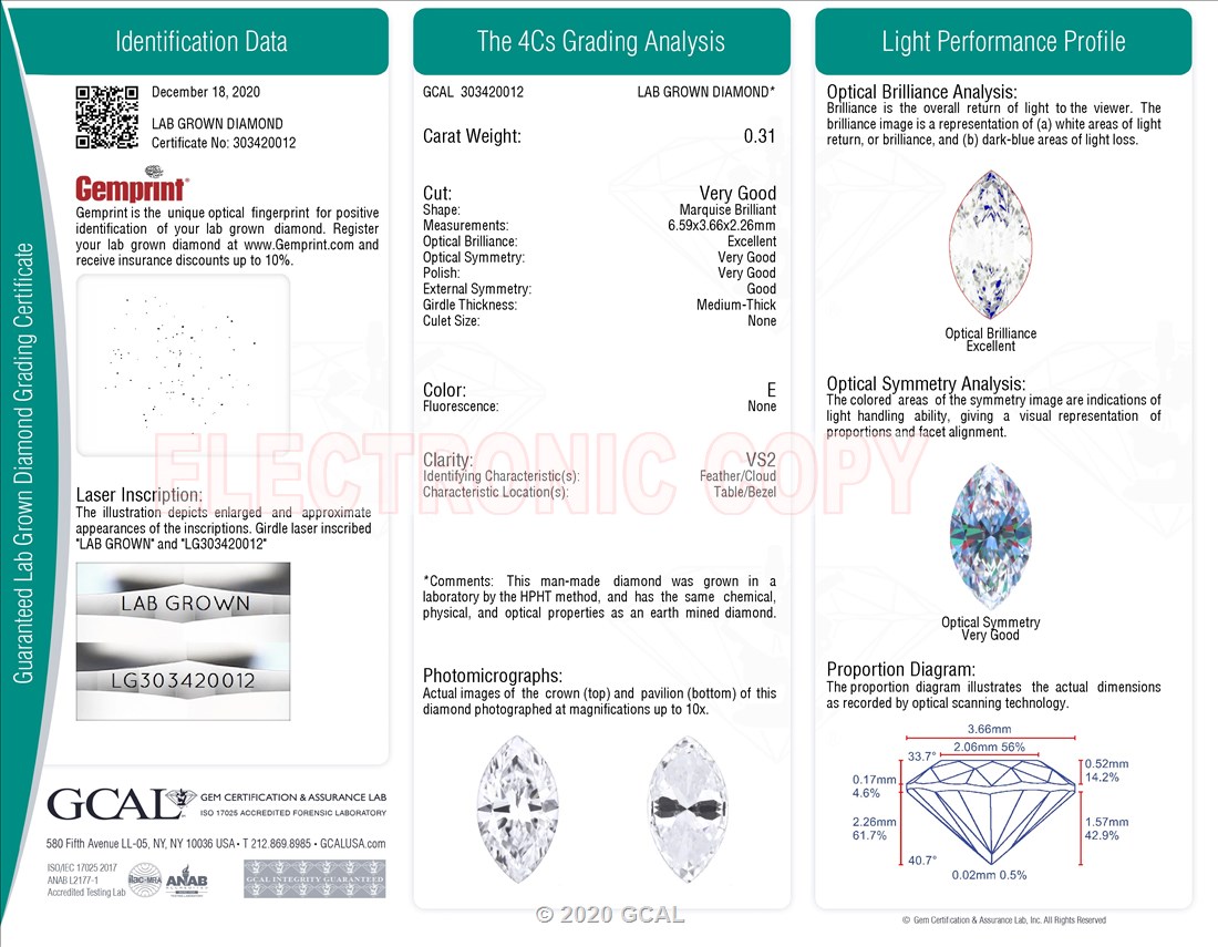 The GCAL certificate (#303420012) is an independent grading report that verifies this diamond's carat weight, color, clarity, cut, and other physical properties. It serves as a trusted third-party guarantee of the stone's quality. Always verify the certificate number on the issuing lab's website before purchasing.