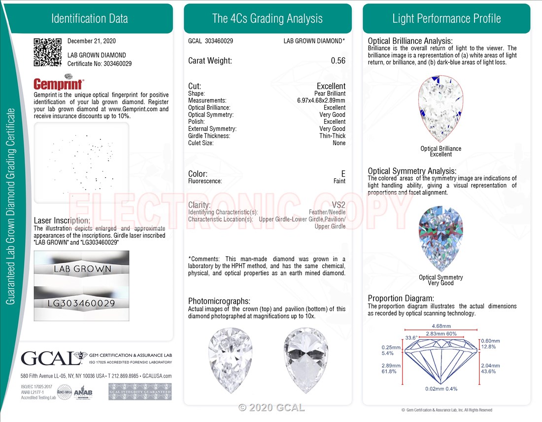 The GCAL certificate (#303460029) is an independent grading report that verifies this diamond's carat weight, color, clarity, cut, and other physical properties. It serves as a trusted third-party guarantee of the stone's quality. Always verify the certificate number on the issuing lab's website before purchasing.
