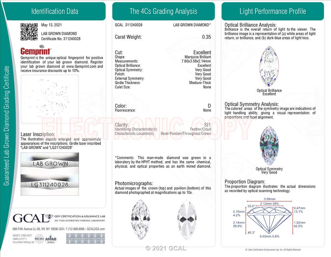 The GCAL certificate (#311240028) is an independent grading report that verifies this diamond's carat weight, color, clarity, cut, and other physical properties. It serves as a trusted third-party guarantee of the stone's quality. Always verify the certificate number on the issuing lab's website before purchasing.