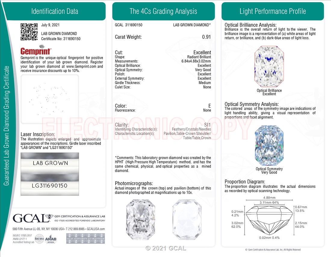 The GCAL certificate (#311690150) is an independent grading report that verifies this diamond's carat weight, color, clarity, cut, and other physical properties. It serves as a trusted third-party guarantee of the stone's quality. Always verify the certificate number on the issuing lab's website before purchasing.