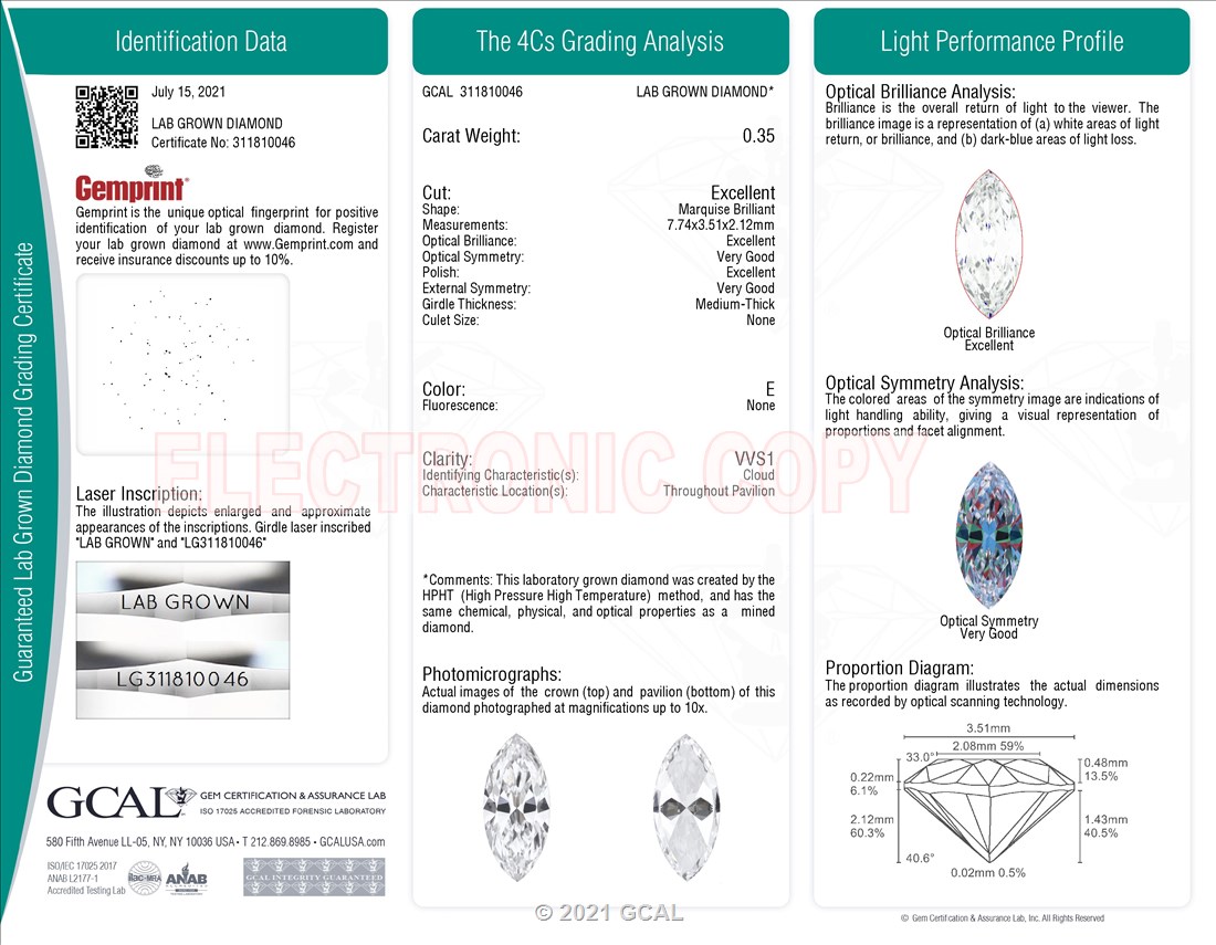 The GCAL certificate (#311810046) is an independent grading report that verifies this diamond's carat weight, color, clarity, cut, and other physical properties. It serves as a trusted third-party guarantee of the stone's quality. Always verify the certificate number on the issuing lab's website before purchasing.