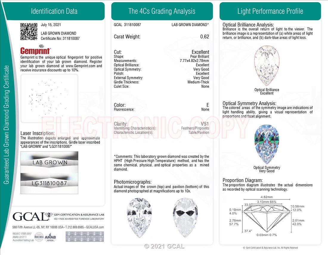 The GCAL certificate (#311810087) is an independent grading report that verifies this diamond's carat weight, color, clarity, cut, and other physical properties. It serves as a trusted third-party guarantee of the stone's quality. Always verify the certificate number on the issuing lab's website before purchasing.