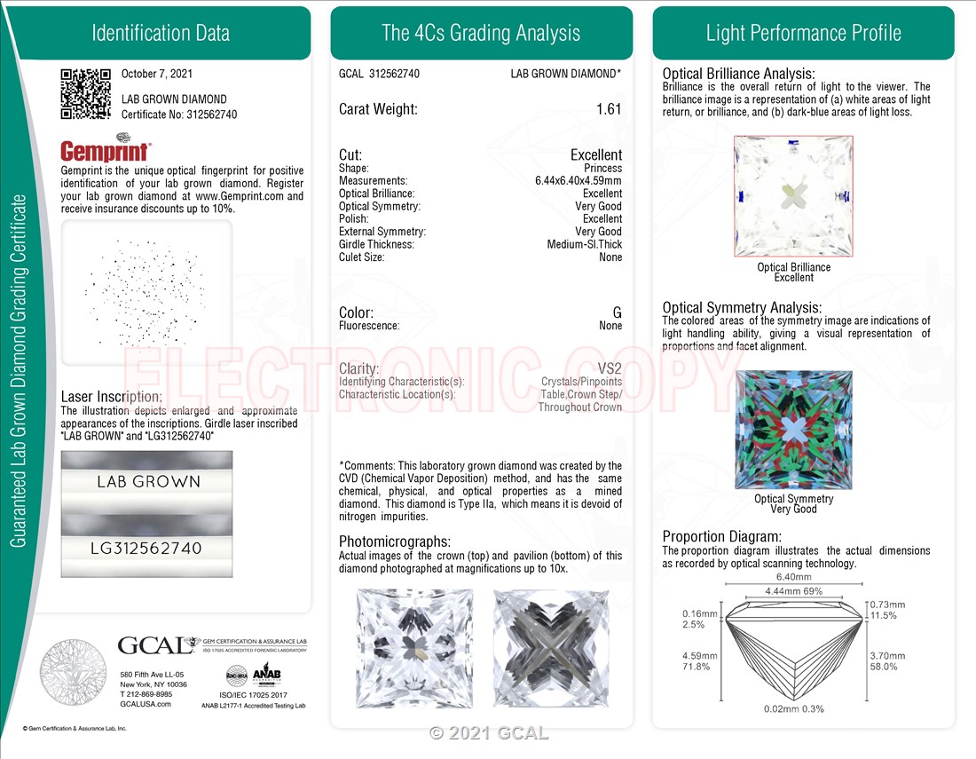 The GCAL certificate (#312562740) is an independent grading report that verifies this diamond's carat weight, color, clarity, cut, and other physical properties. It serves as a trusted third-party guarantee of the stone's quality. Always verify the certificate number on the issuing lab's website before purchasing.