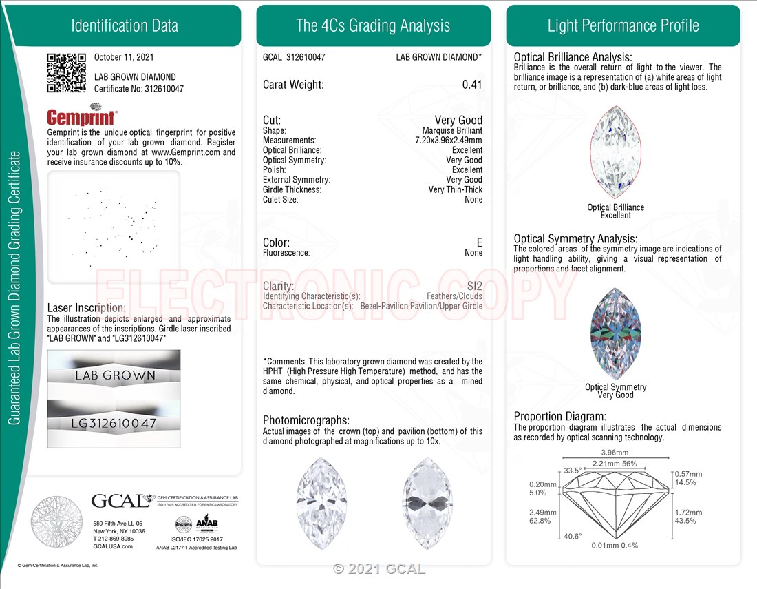 The GCAL certificate (#312610047) is an independent grading report that verifies this diamond's carat weight, color, clarity, cut, and other physical properties. It serves as a trusted third-party guarantee of the stone's quality. Always verify the certificate number on the issuing lab's website before purchasing.