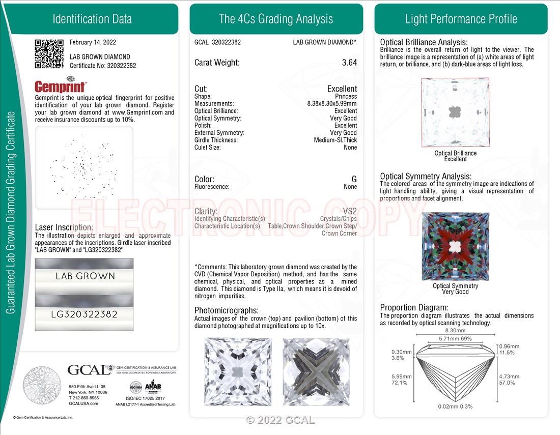 The GCAL certificate (#320322382) is an independent grading report that verifies this diamond's carat weight, color, clarity, cut, and other physical properties. It serves as a trusted third-party guarantee of the stone's quality. Always verify the certificate number on the issuing lab's website before purchasing.