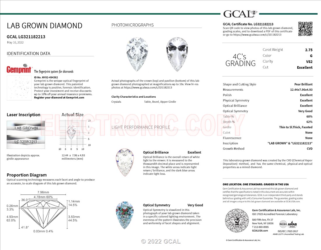 The GCAL certificate (#321182213) is an independent grading report that verifies this diamond's carat weight, color, clarity, cut, and other physical properties. It serves as a trusted third-party guarantee of the stone's quality. Always verify the certificate number on the issuing lab's website before purchasing.