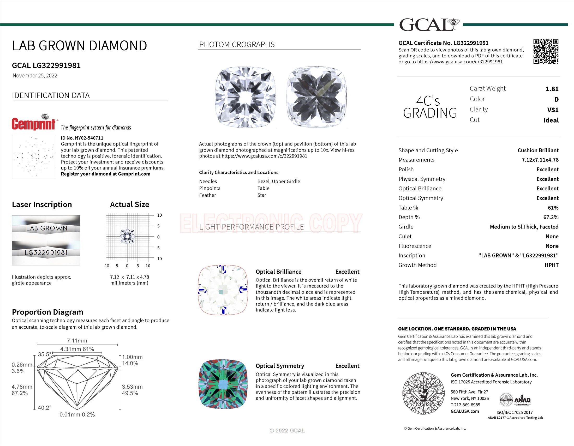 The GCAL certificate (#322991981) is an independent grading report that verifies this diamond's carat weight, color, clarity, cut, and other physical properties. It serves as a trusted third-party guarantee of the stone's quality. Always verify the certificate number on the issuing lab's website before purchasing.