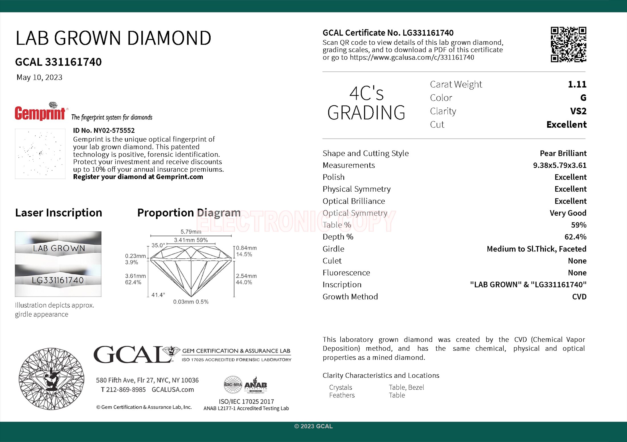 The GCAL certificate (#331161740) is an independent grading report that verifies this diamond's carat weight, color, clarity, cut, and other physical properties. It serves as a trusted third-party guarantee of the stone's quality. Always verify the certificate number on the issuing lab's website before purchasing.
