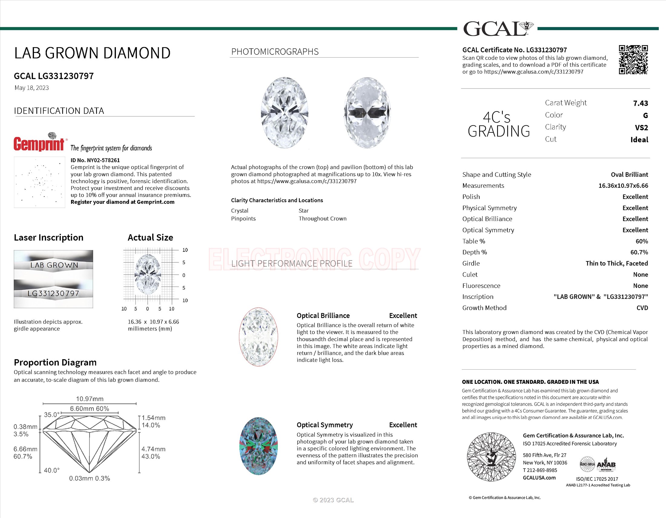 The GCAL certificate (#331230797) is an independent grading report that verifies this diamond's carat weight, color, clarity, cut, and other physical properties. It serves as a trusted third-party guarantee of the stone's quality. Always verify the certificate number on the issuing lab's website before purchasing.