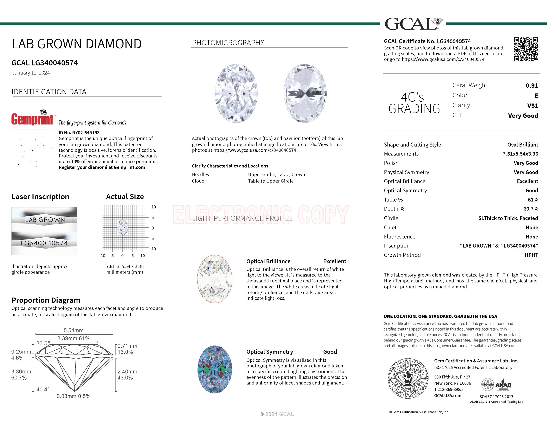 The GCAL certificate (#340040574) is an independent grading report that verifies this diamond's carat weight, color, clarity, cut, and other physical properties. It serves as a trusted third-party guarantee of the stone's quality. Always verify the certificate number on the issuing lab's website before purchasing.