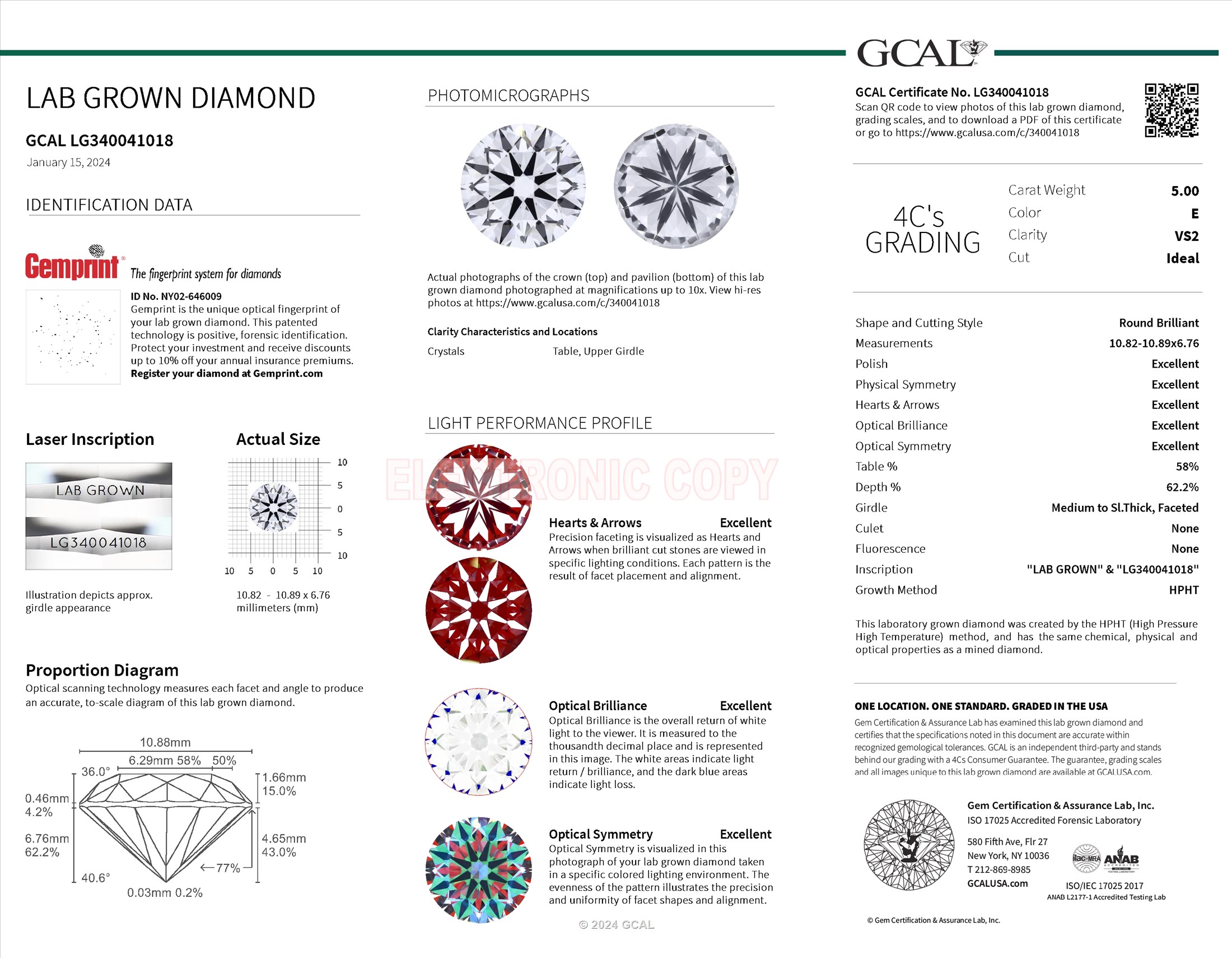 The GCAL certificate (#340041018) is an independent grading report that verifies this diamond's carat weight, color, clarity, cut, and other physical properties. It serves as a trusted third-party guarantee of the stone's quality. Always verify the certificate number on the issuing lab's website before purchasing.
