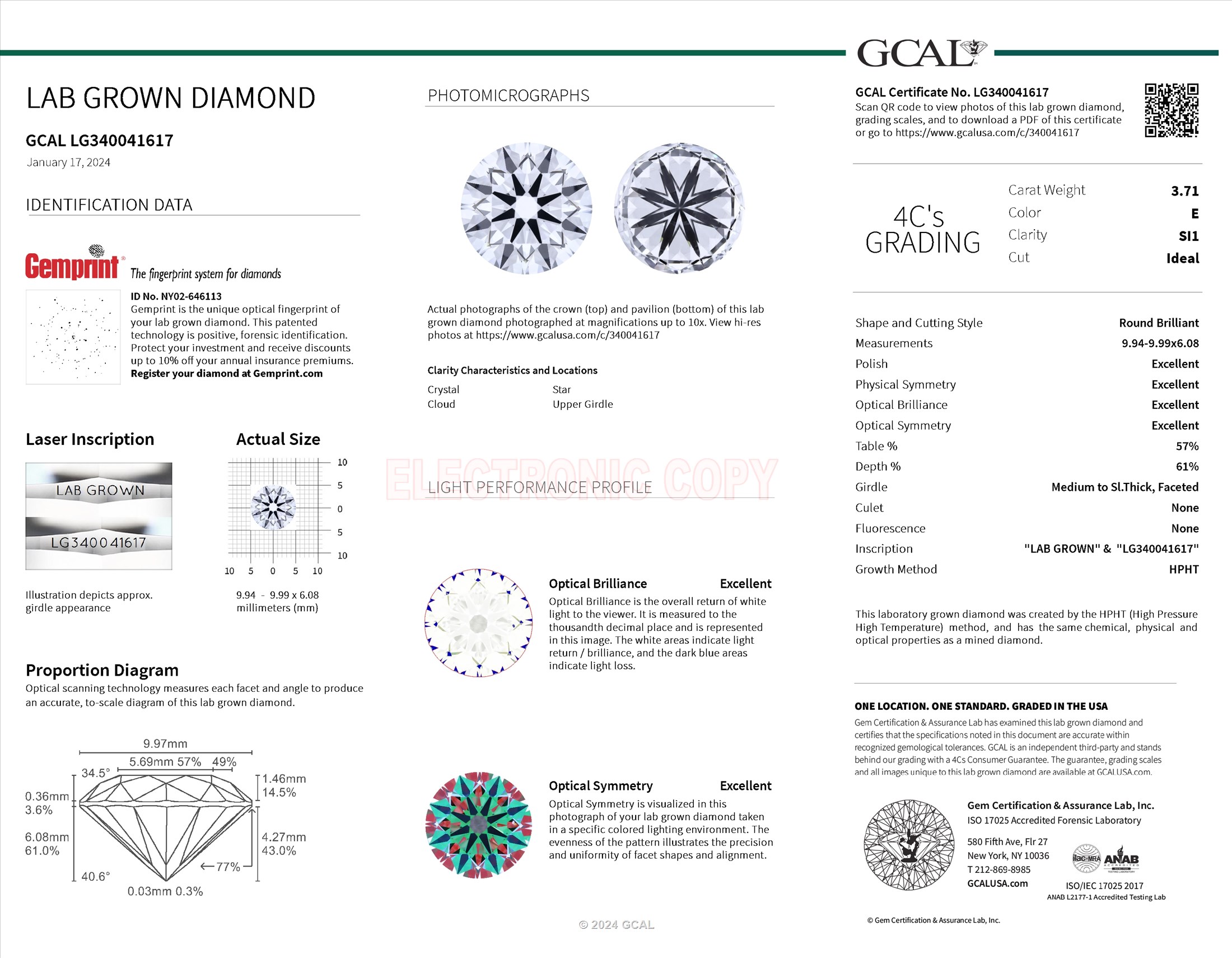 The GCAL certificate (#340041617) is an independent grading report that verifies this diamond's carat weight, color, clarity, cut, and other physical properties. It serves as a trusted third-party guarantee of the stone's quality. Always verify the certificate number on the issuing lab's website before purchasing.