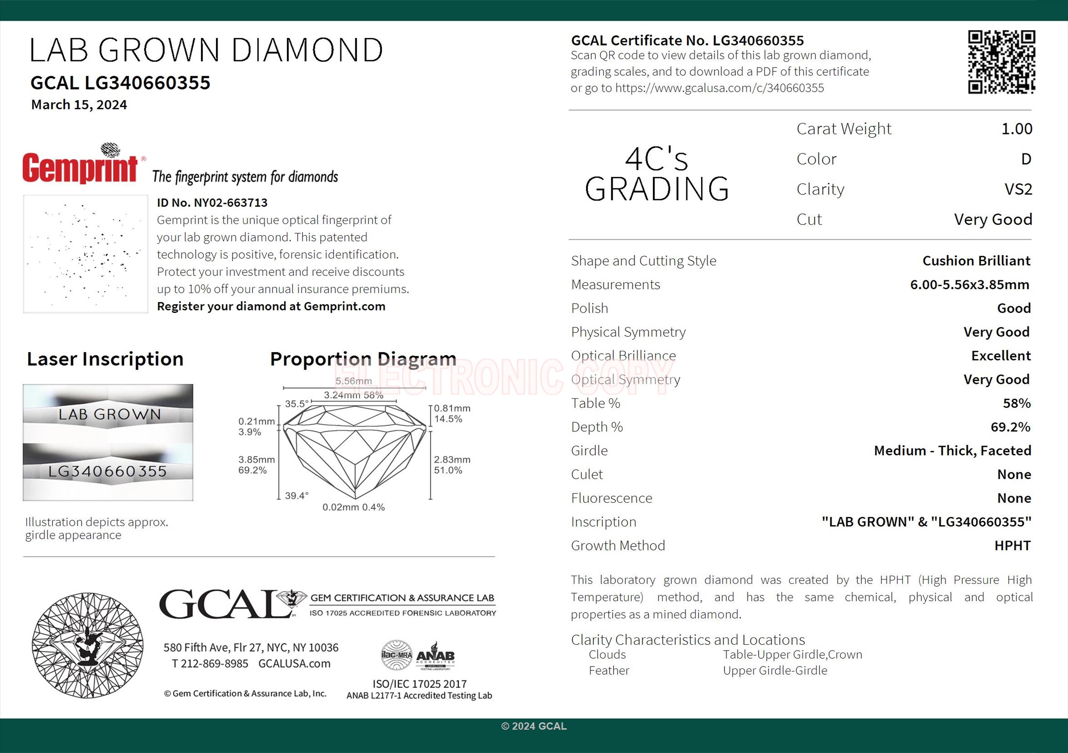The GCAL certificate (#340660355) is an independent grading report that verifies this diamond's carat weight, color, clarity, cut, and other physical properties. It serves as a trusted third-party guarantee of the stone's quality. Always verify the certificate number on the issuing lab's website before purchasing.