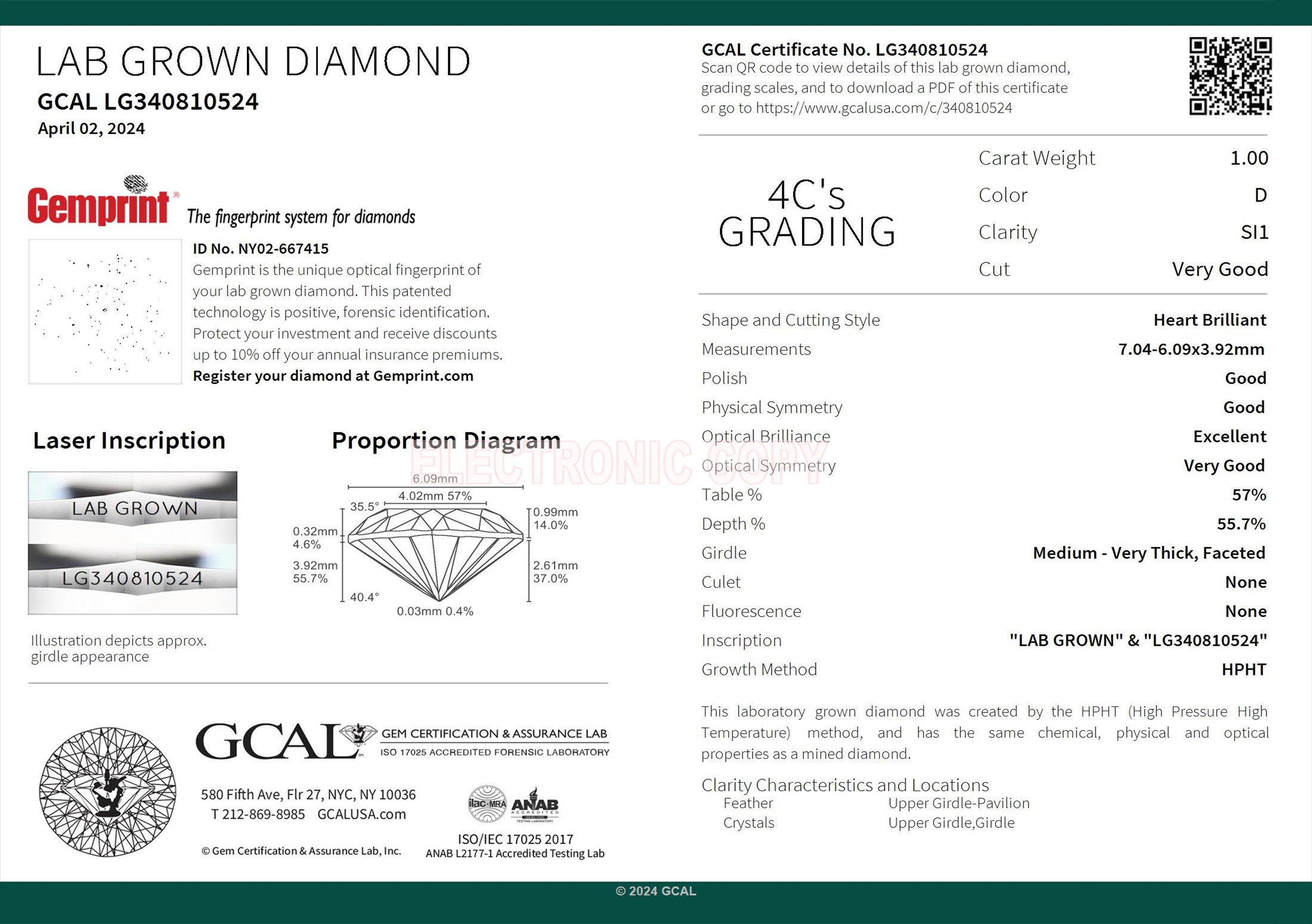 The GCAL certificate (#340810524) is an independent grading report that verifies this diamond's carat weight, color, clarity, cut, and other physical properties. It serves as a trusted third-party guarantee of the stone's quality. Always verify the certificate number on the issuing lab's website before purchasing.