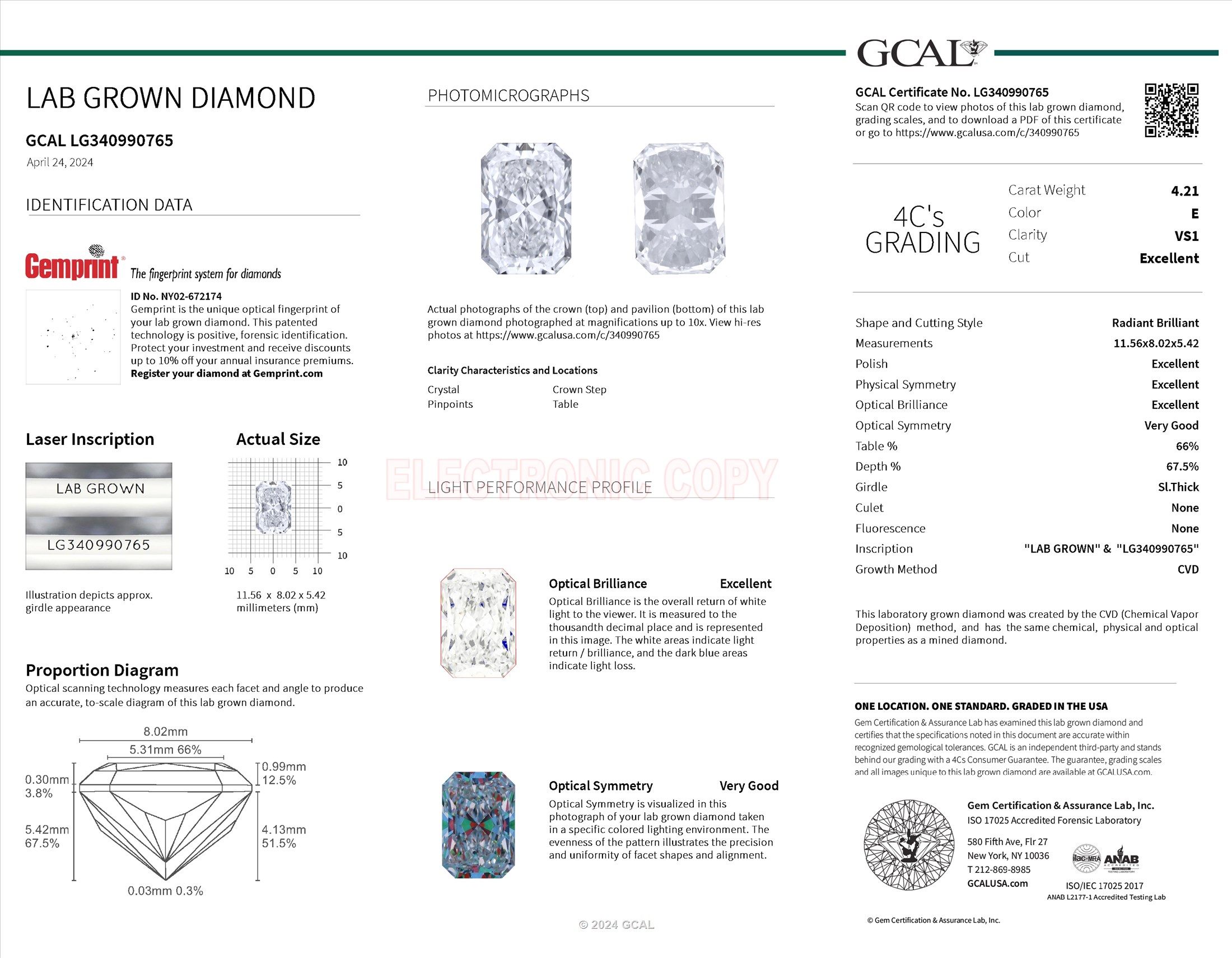 The GCAL certificate (#340990765) is an independent grading report that verifies this diamond's carat weight, color, clarity, cut, and other physical properties. It serves as a trusted third-party guarantee of the stone's quality. Always verify the certificate number on the issuing lab's website before purchasing.