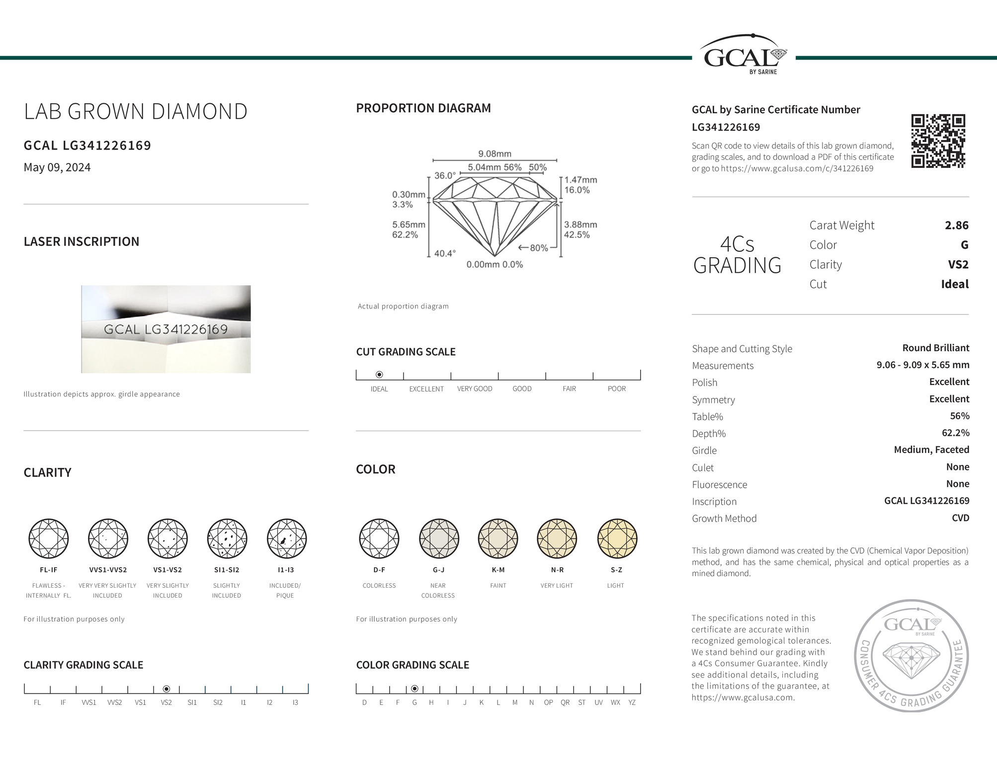 The GCAL certificate (#341226169) is an independent grading report that verifies this diamond's carat weight, color, clarity, cut, and other physical properties. It serves as a trusted third-party guarantee of the stone's quality. Always verify the certificate number on the issuing lab's website before purchasing.