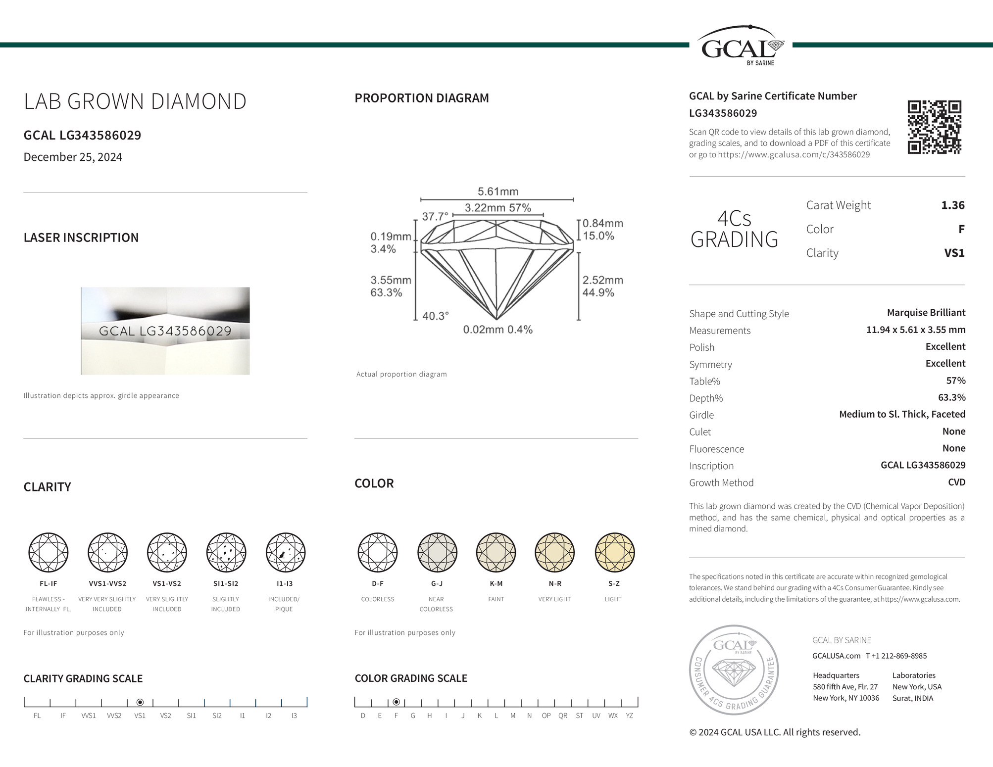 The GCAL certificate (#343586029) is an independent grading report that verifies this diamond's carat weight, color, clarity, cut, and other physical properties. It serves as a trusted third-party guarantee of the stone's quality. Always verify the certificate number on the issuing lab's website before purchasing.