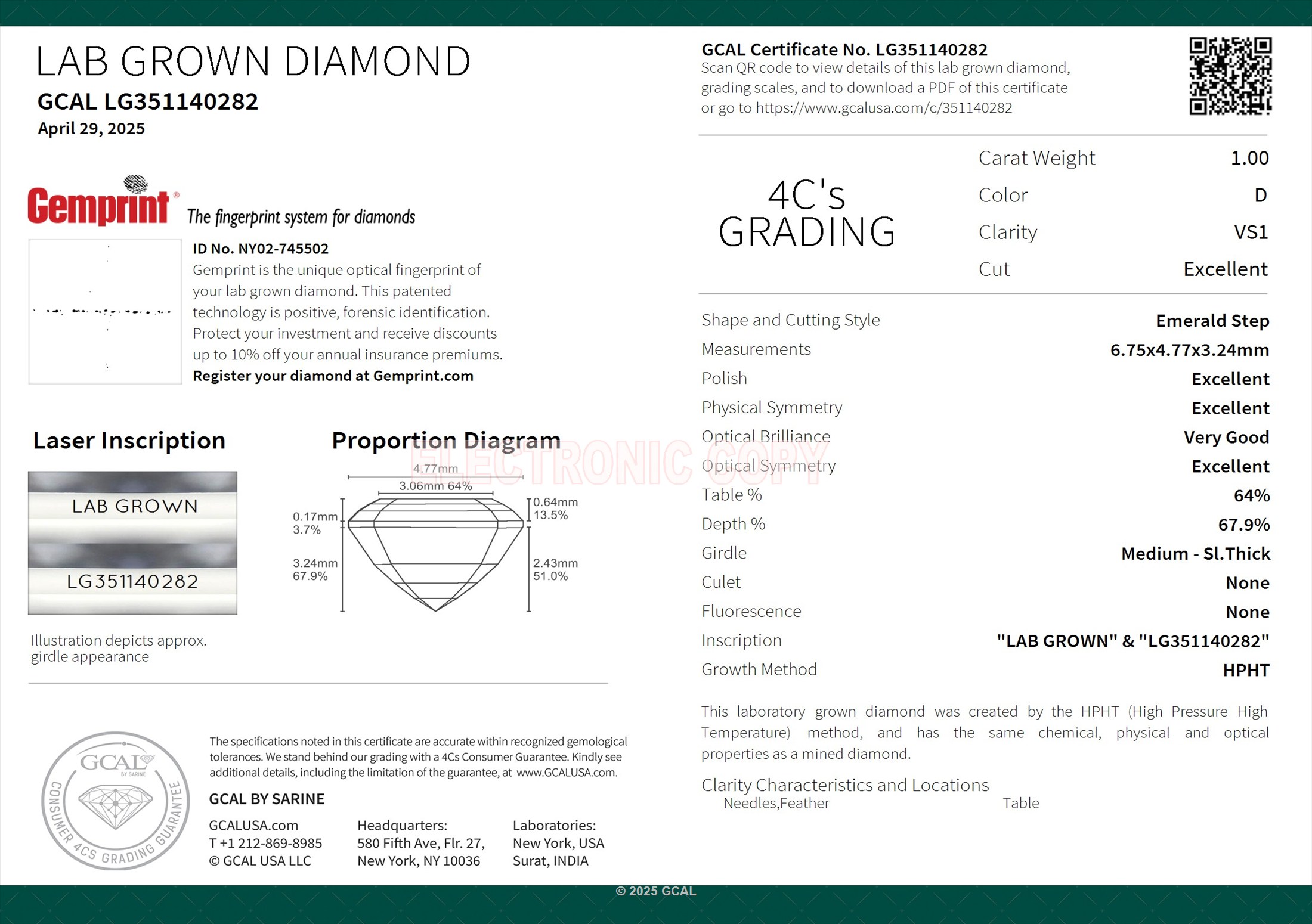 The GCAL certificate (#351140282) is an independent grading report that verifies this diamond's carat weight, color, clarity, cut, and other physical properties. It serves as a trusted third-party guarantee of the stone's quality. Always verify the certificate number on the issuing lab's website before purchasing.