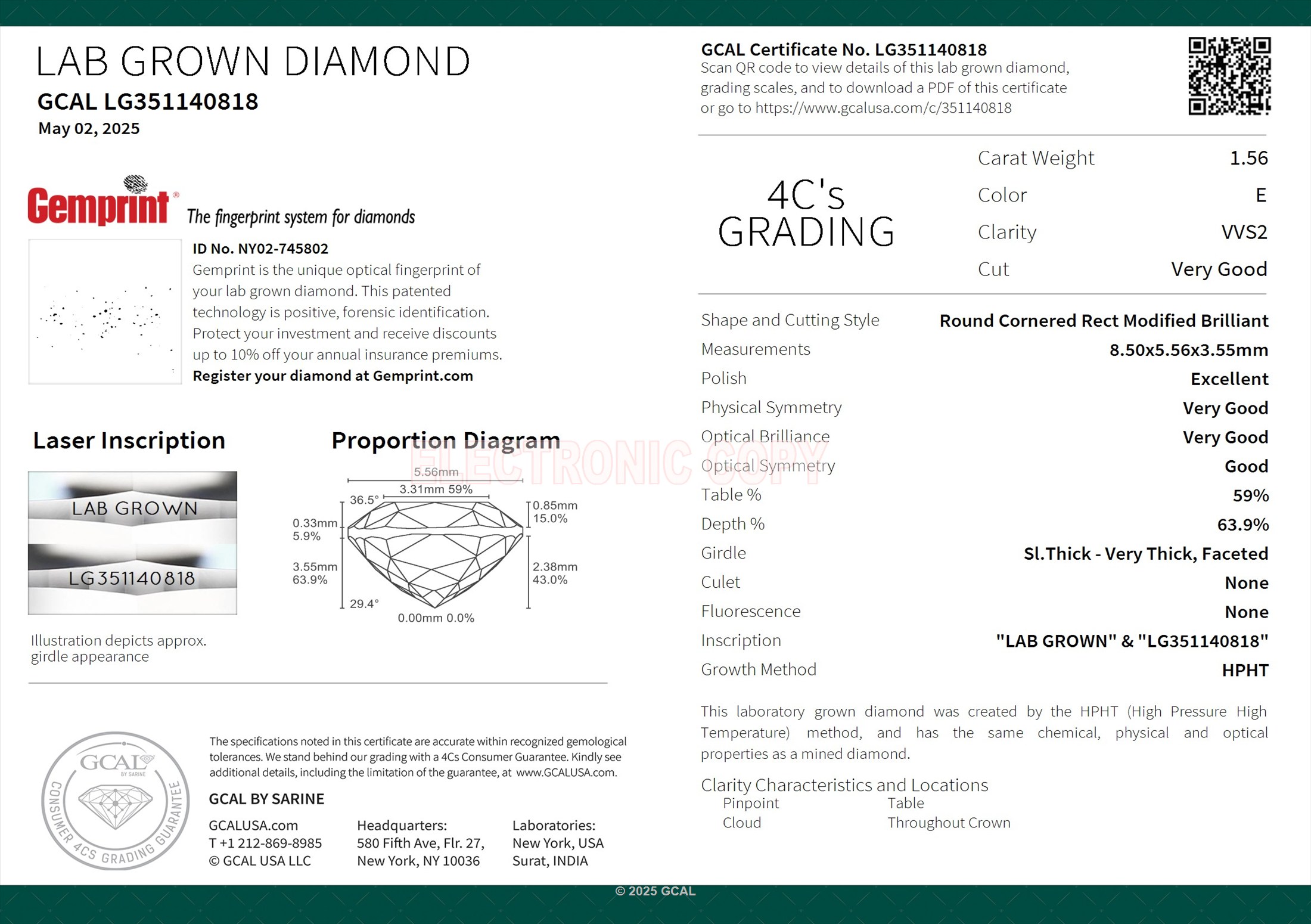 The GCAL certificate (#351140818) is an independent grading report that verifies this diamond's carat weight, color, clarity, cut, and other physical properties. It serves as a trusted third-party guarantee of the stone's quality. Always verify the certificate number on the issuing lab's website before purchasing.
