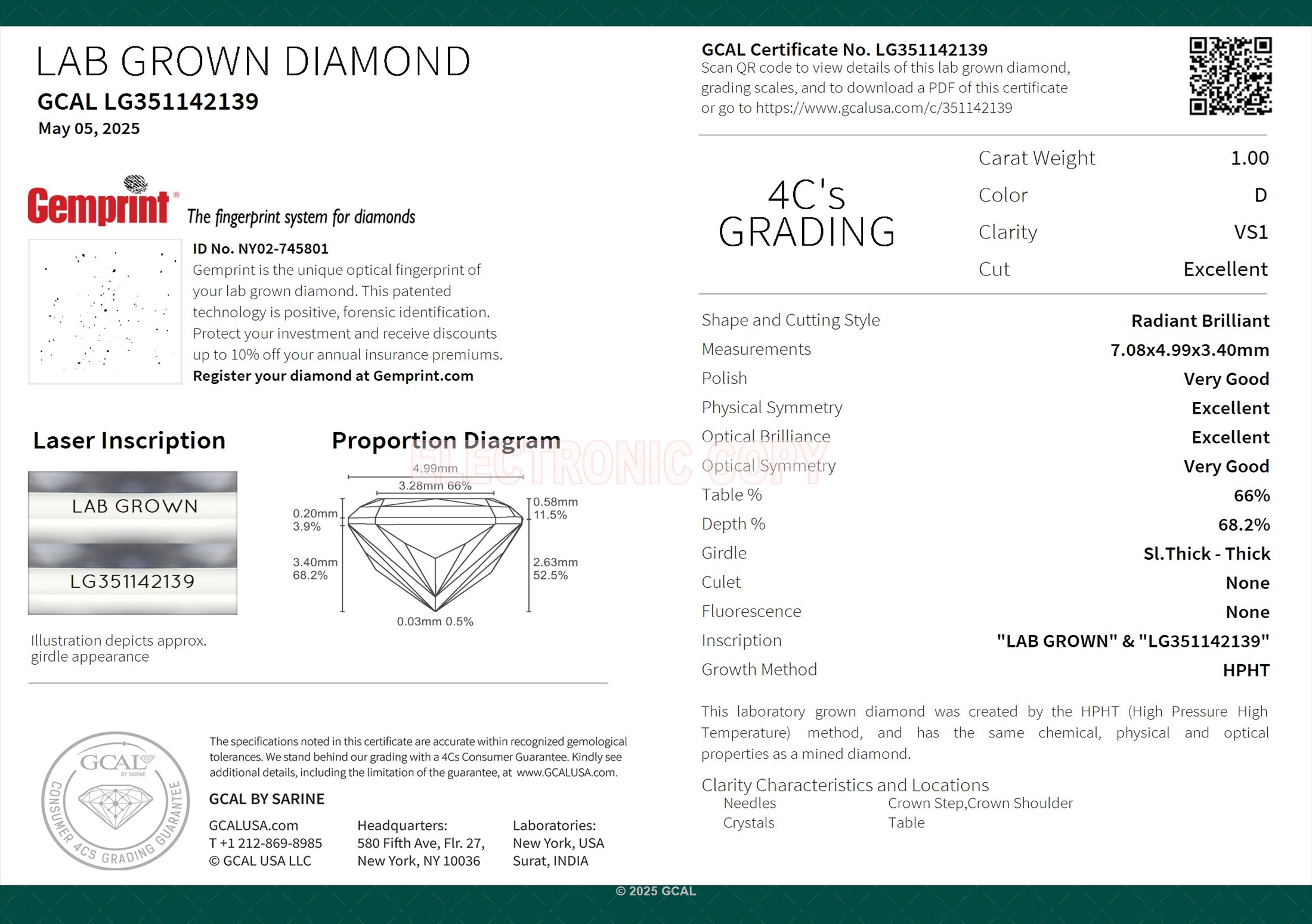 The GCAL certificate (#351142139) is an independent grading report that verifies this diamond's carat weight, color, clarity, cut, and other physical properties. It serves as a trusted third-party guarantee of the stone's quality. Always verify the certificate number on the issuing lab's website before purchasing.
