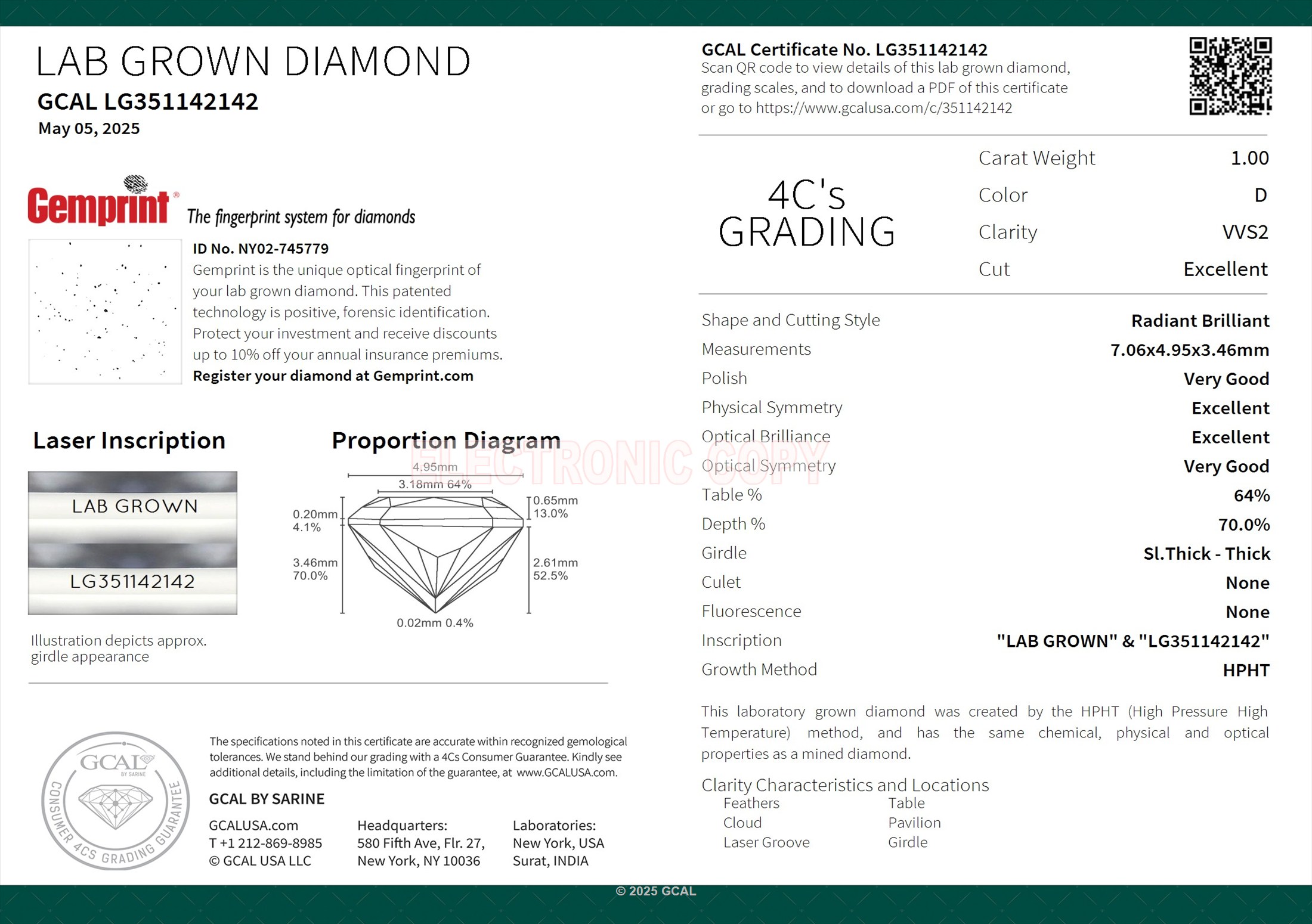 The GCAL certificate (#351142142) is an independent grading report that verifies this diamond's carat weight, color, clarity, cut, and other physical properties. It serves as a trusted third-party guarantee of the stone's quality. Always verify the certificate number on the issuing lab's website before purchasing.