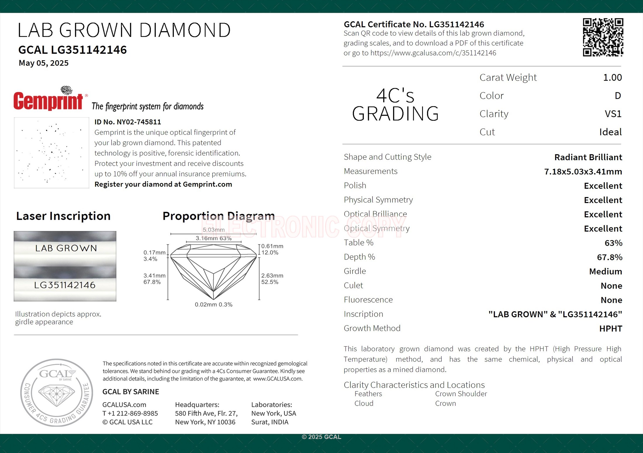 The GCAL certificate (#351142146) is an independent grading report that verifies this diamond's carat weight, color, clarity, cut, and other physical properties. It serves as a trusted third-party guarantee of the stone's quality. Always verify the certificate number on the issuing lab's website before purchasing.