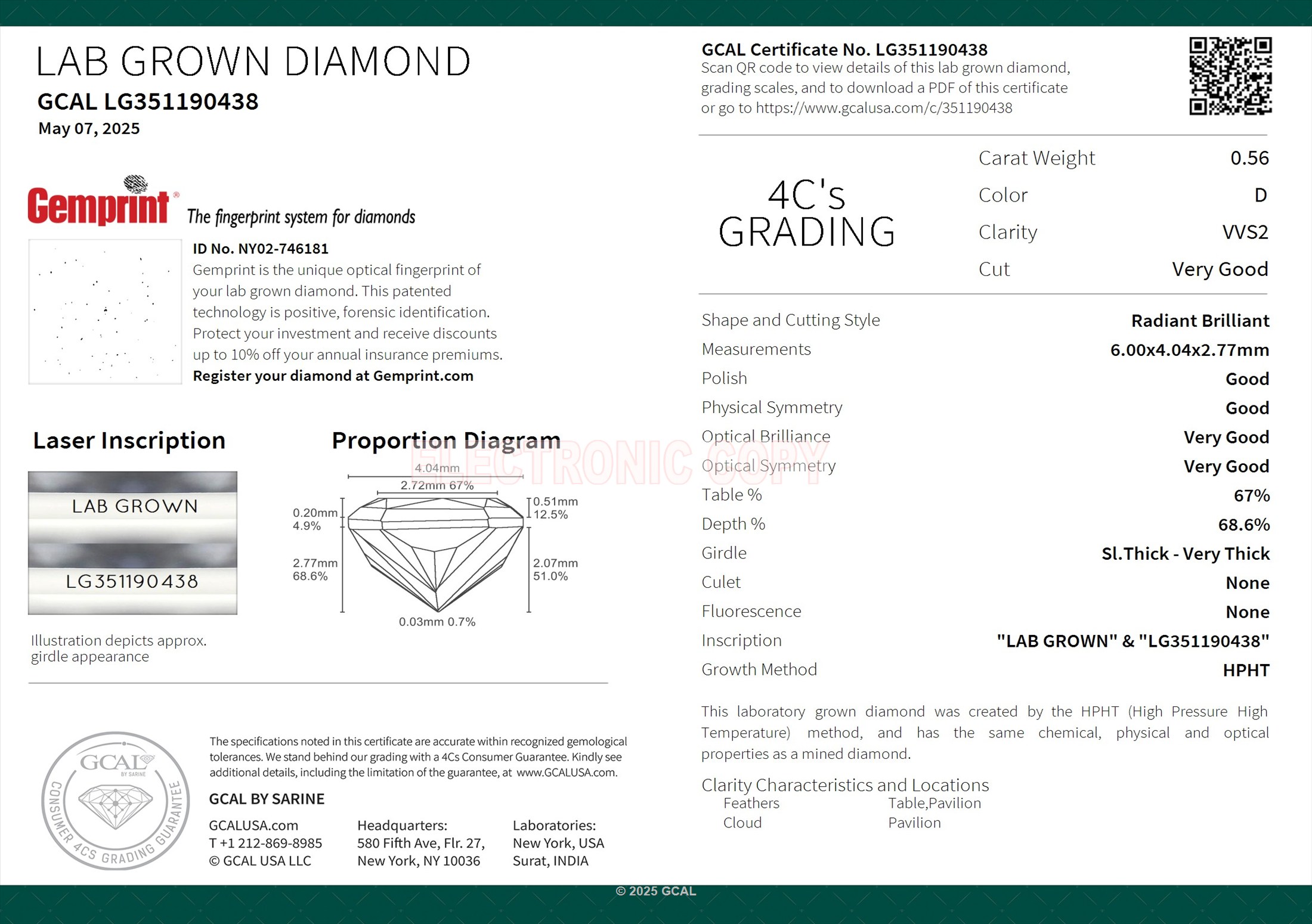The GCAL certificate (#351190438) is an independent grading report that verifies this diamond's carat weight, color, clarity, cut, and other physical properties. It serves as a trusted third-party guarantee of the stone's quality. Always verify the certificate number on the issuing lab's website before purchasing.