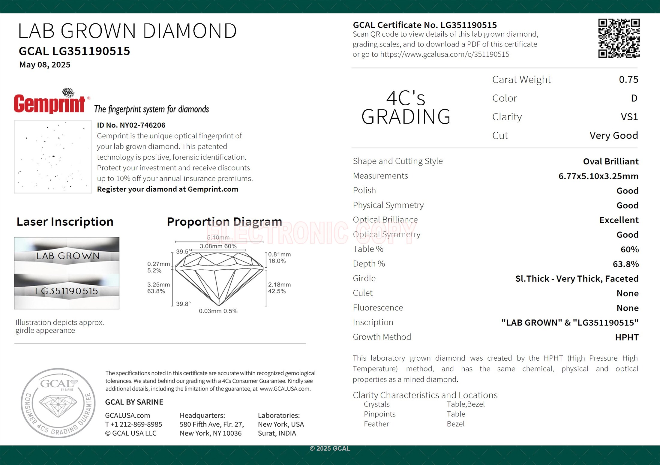 The GCAL certificate (#351190515) is an independent grading report that verifies this diamond's carat weight, color, clarity, cut, and other physical properties. It serves as a trusted third-party guarantee of the stone's quality. Always verify the certificate number on the issuing lab's website before purchasing.
