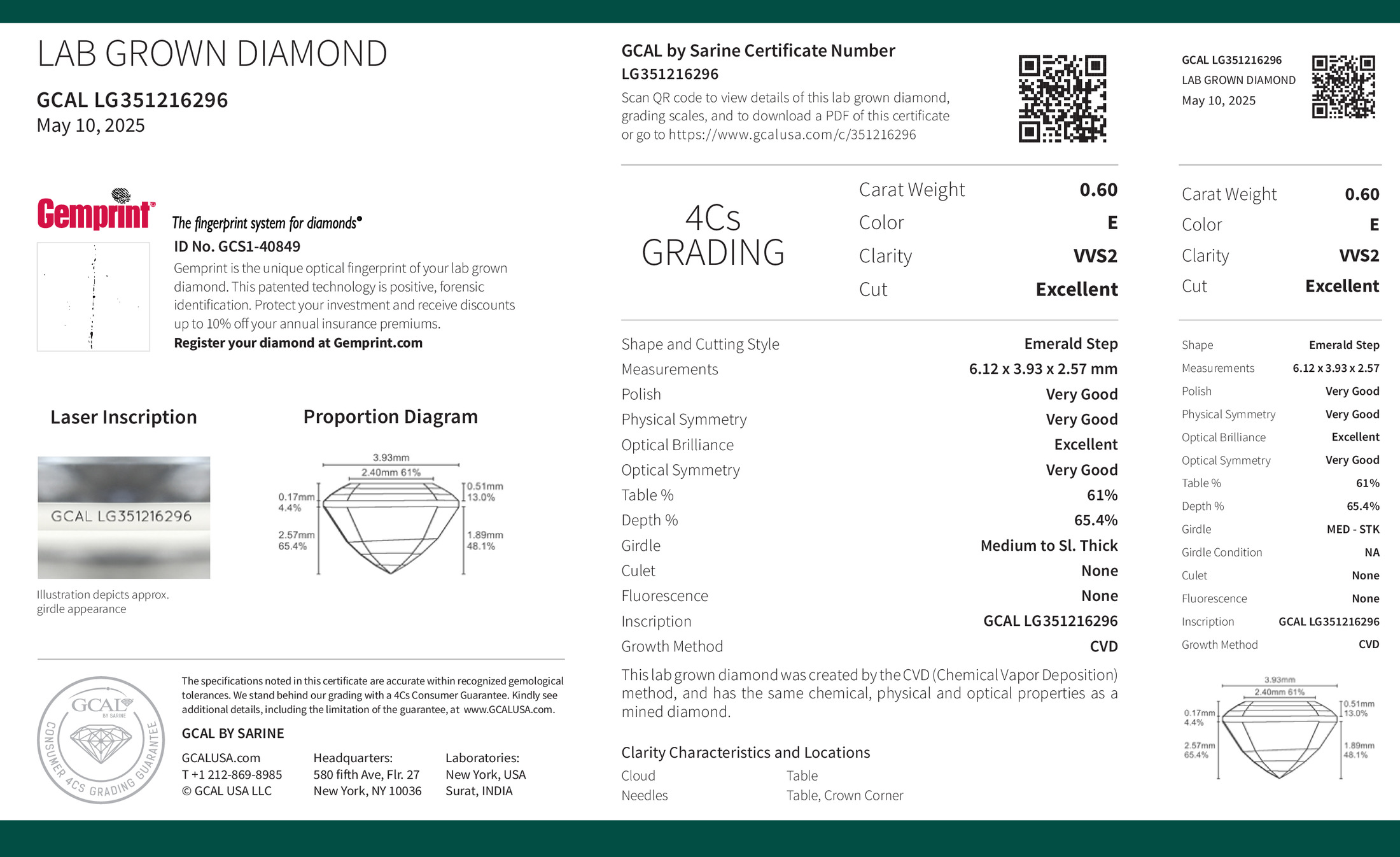 The GCAL certificate (#351216296) is an independent grading report that verifies this diamond's carat weight, color, clarity, cut, and other physical properties. It serves as a trusted third-party guarantee of the stone's quality. Always verify the certificate number on the issuing lab's website before purchasing.