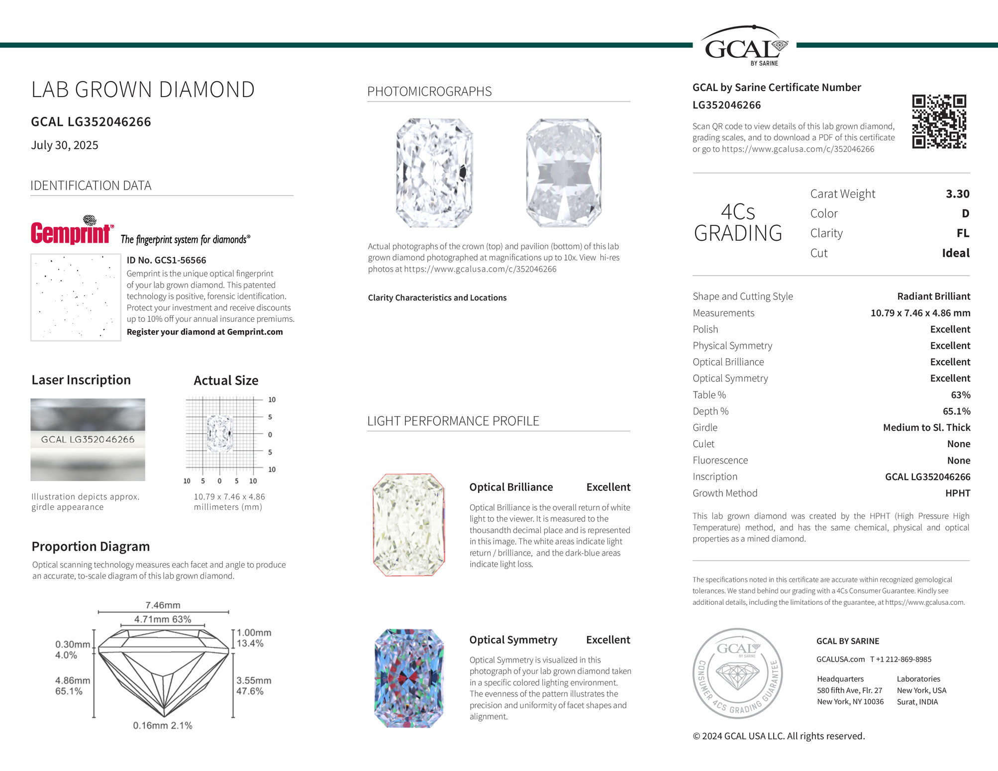 The GCAL certificate (#352046266) is an independent grading report that verifies this diamond's carat weight, color, clarity, cut, and other physical properties. It serves as a trusted third-party guarantee of the stone's quality. Always verify the certificate number on the issuing lab's website before purchasing.